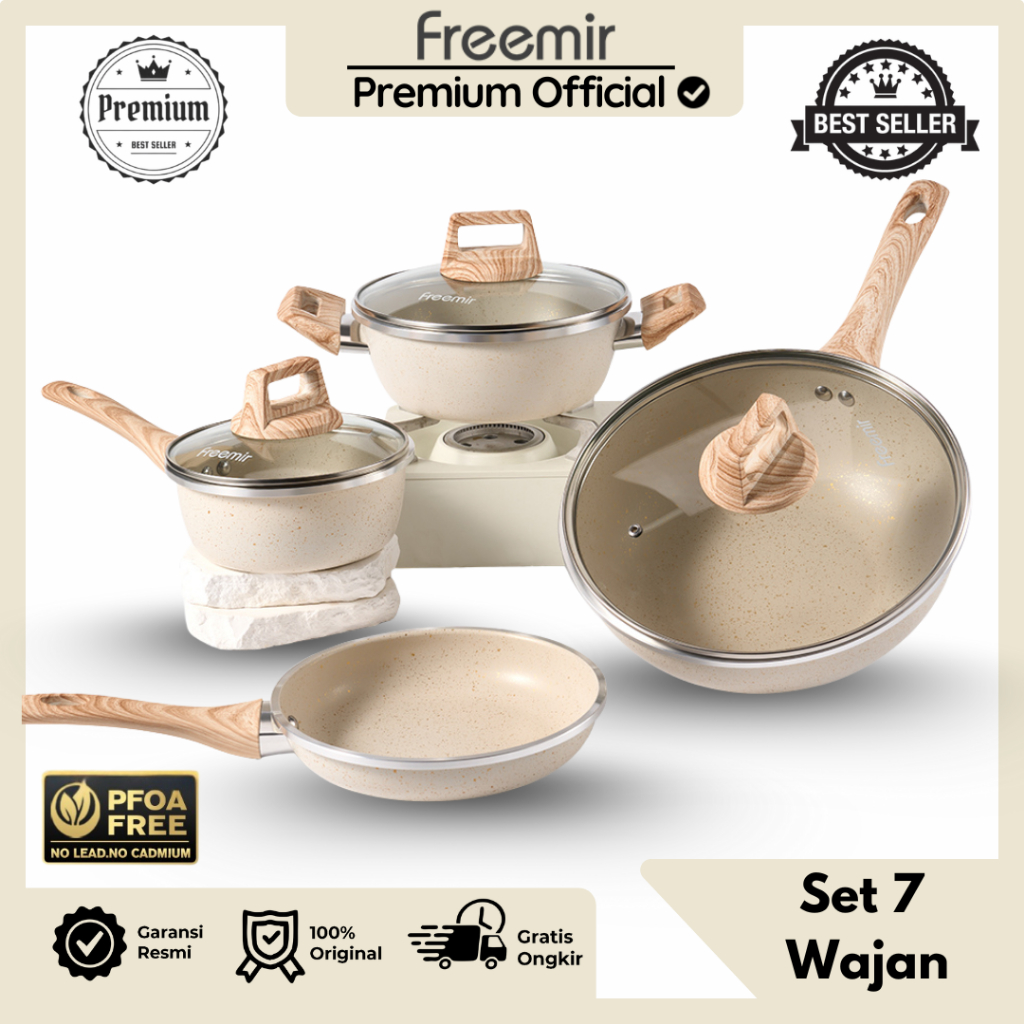 [PREMIUM] freemir Set 7 Pcs Wajan Panci Beige/Hijau Dengan Tutup Anti Lengket Marble Lapisan Granit