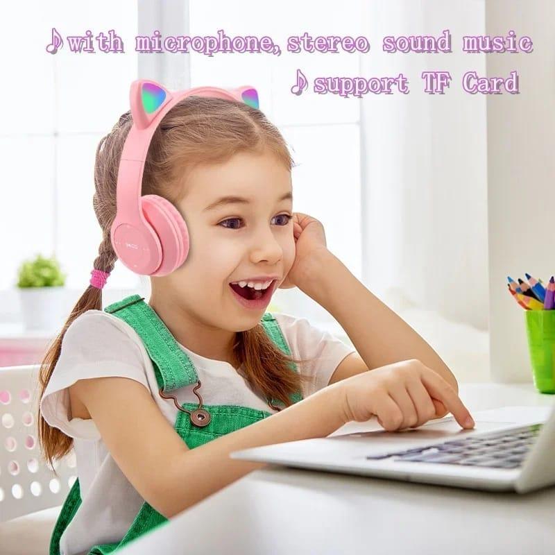 Headphone Wireless P47M Cat Ear Bluetooth LED Stereo Anak Lipat Lucu dan Nyaman