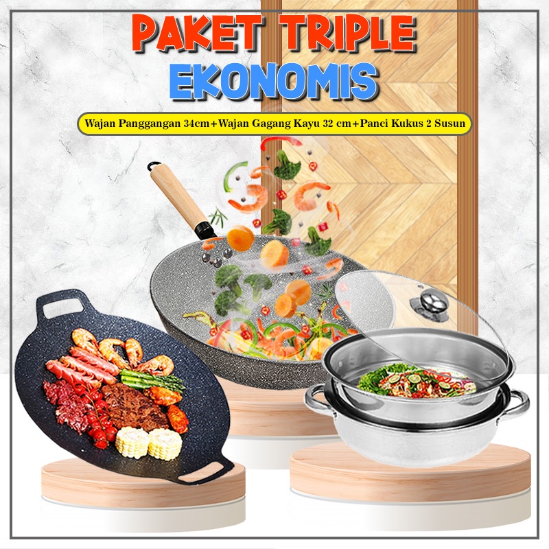 (SS) Paket Triple Ekonomis Paket Panci Panggangan 34cm + Panci Kukus 2 Susun + Wajan gagang Kayu Diameter 32cm