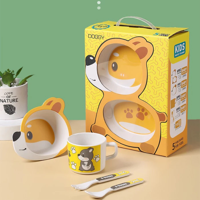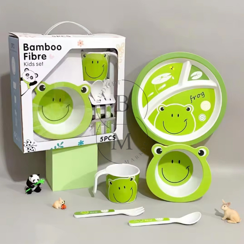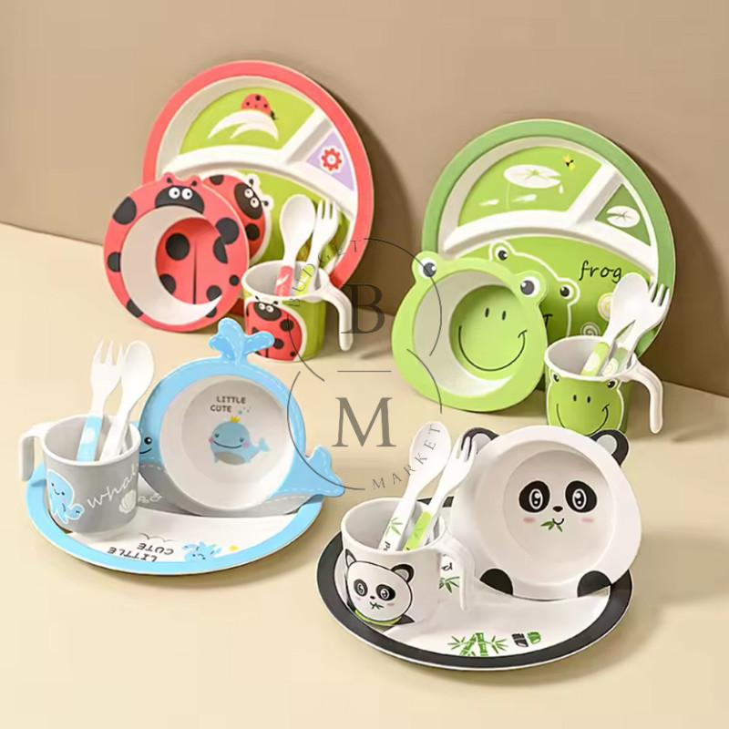 5 in 1 Bamboo Fiber Kids Feeding Set / Baby Bowl Set Alat Piring Makan Anak Mangkok Anak Bayi Motif Karakter Lucu / Box Set Garpu sendok gelas