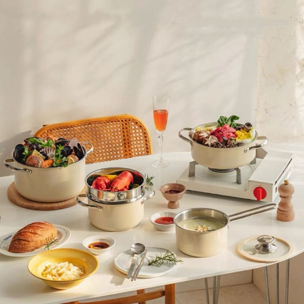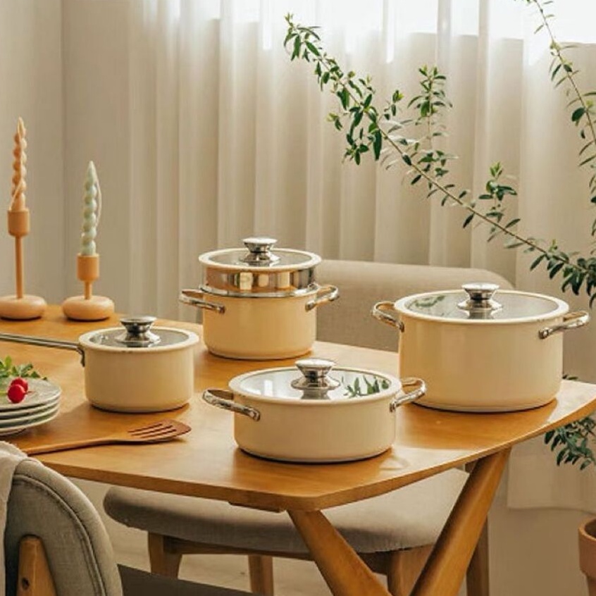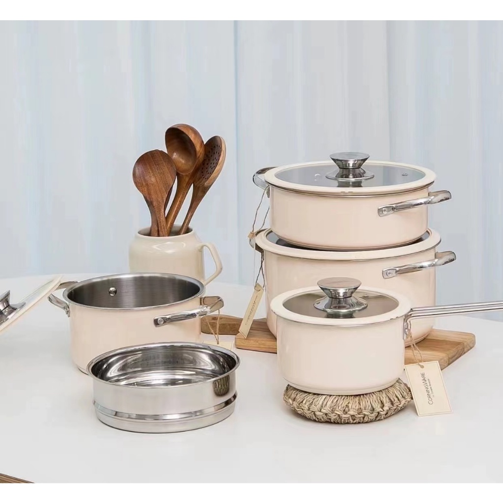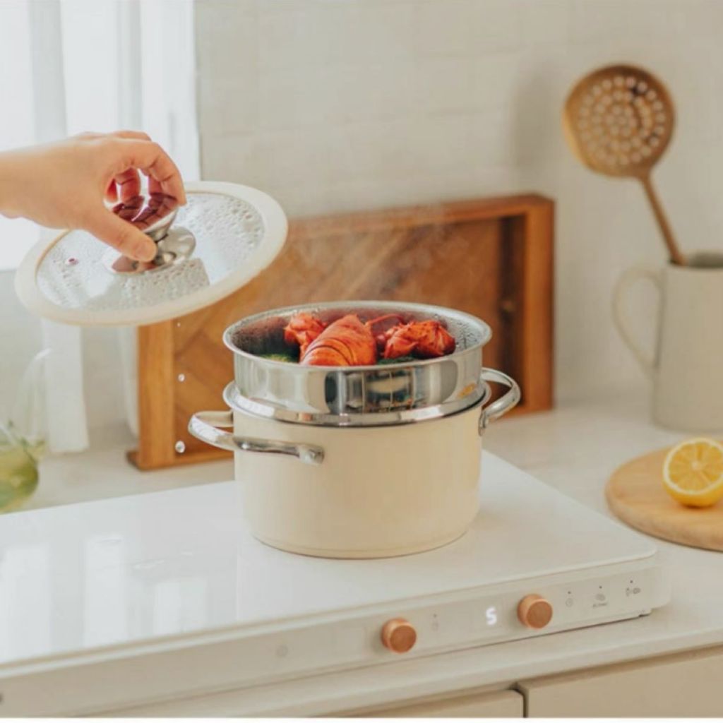 99KHOME Premium Saucepan Stockpot Cookware Set Steamer Stainless Steel Panci Kukus Anti Lengket Dengan Tutup Kaca Cream H648