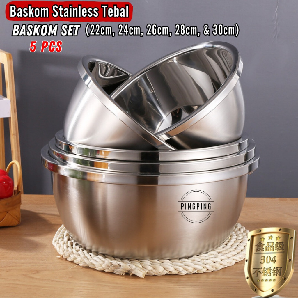 Baskom Set Stainless Tebal 5IN1 Wadah Cuci Beras Buah Sayur / Set Baskom Mangkuk Premium Isi 5 Pcs Tebal & Tinggi Stainless