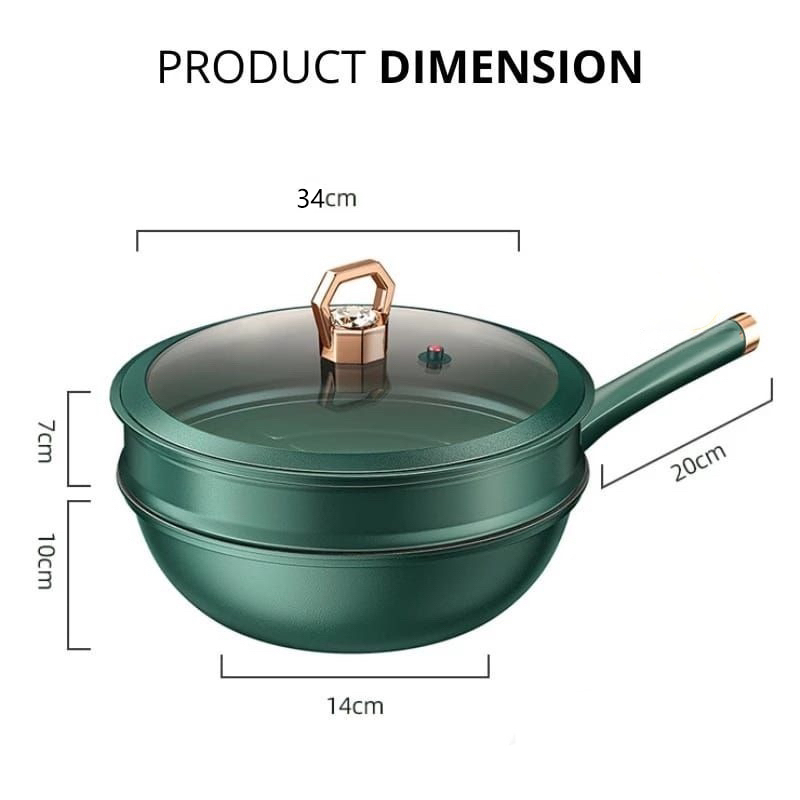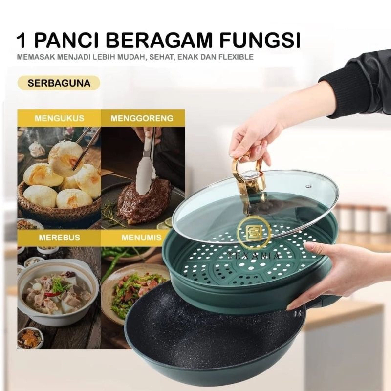 3IN1 Wajan Batu Medis dengan Steamer 32 CM Panci Kukus PREMIUM Super Tebal / Panci Kukus Serbaguna