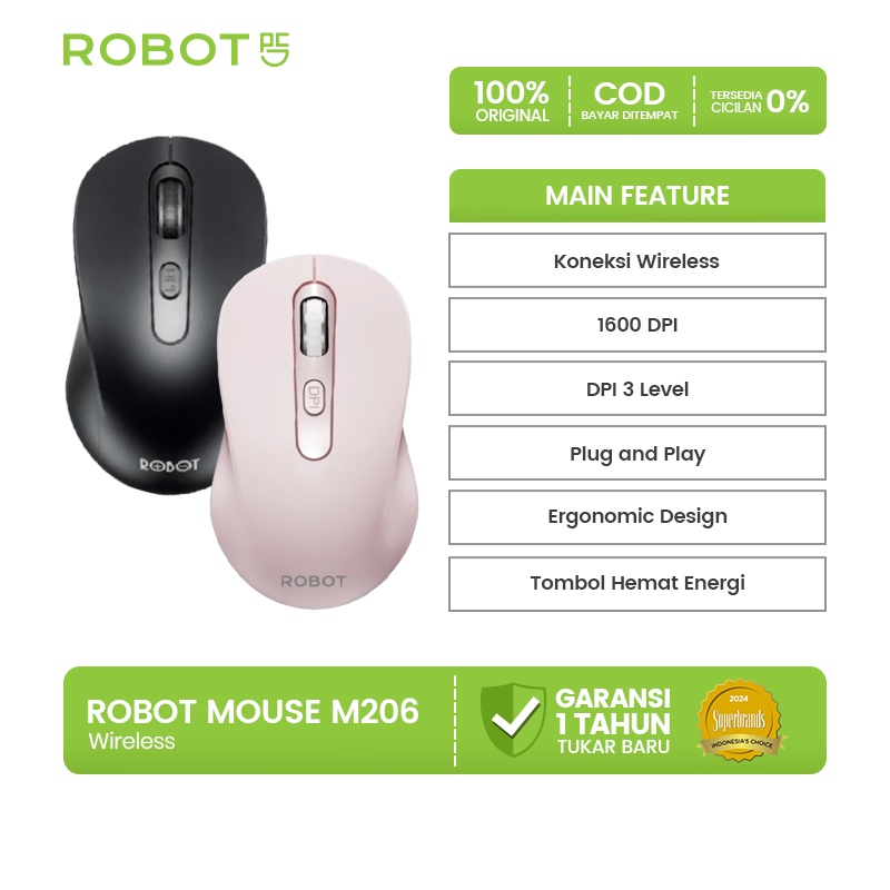 Mouse Wireless ROBOT M206 Tanpa Kabel 24G USB untuk Windows Mac Linux dan ChromeOS