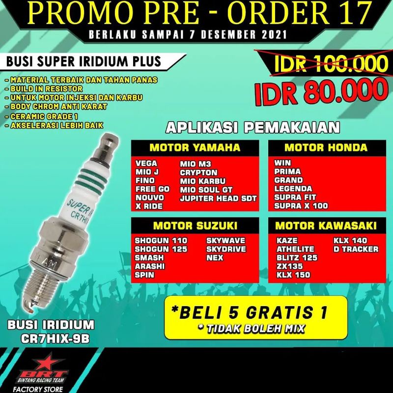 BUSI BRT IRIDIUM MIO GRAND KLX150 JUPITERZ VEGA M3 FINO SUPRA FIT KAZE SOUL GT XRIDE NOUVO WIN SHOGUN SMASH NEX SKYDRIVE BLIZT DTRACKER CR7HIX