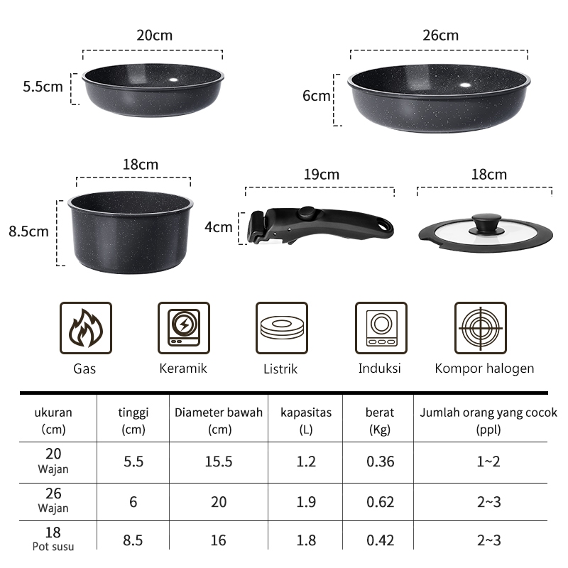 GiPP 5 Pcs Set Peralatan Masak Panci & Wajan Granite Anti Lengket – Gagang Lepas Pasang