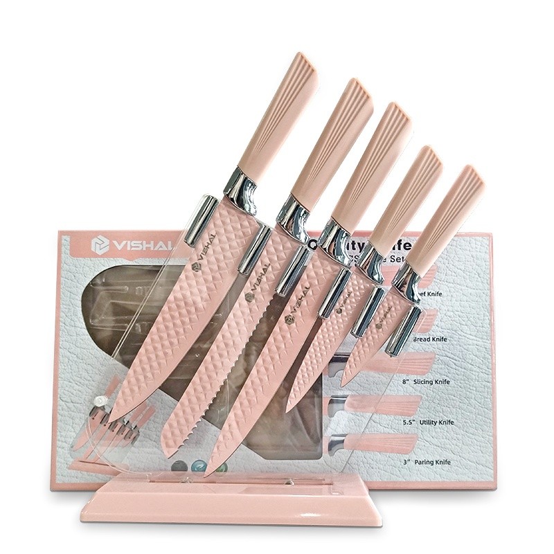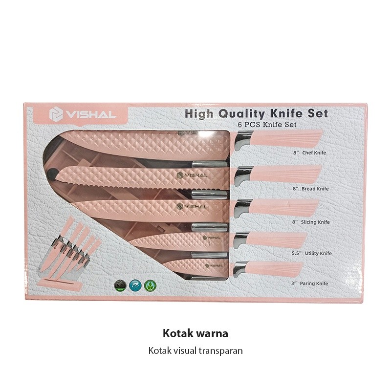 Cocooo- 6 IN 1 Knife Set / Pisau Dapur / Pisau / Ada Tempat Pisau Berlian Merah muda VS-1845