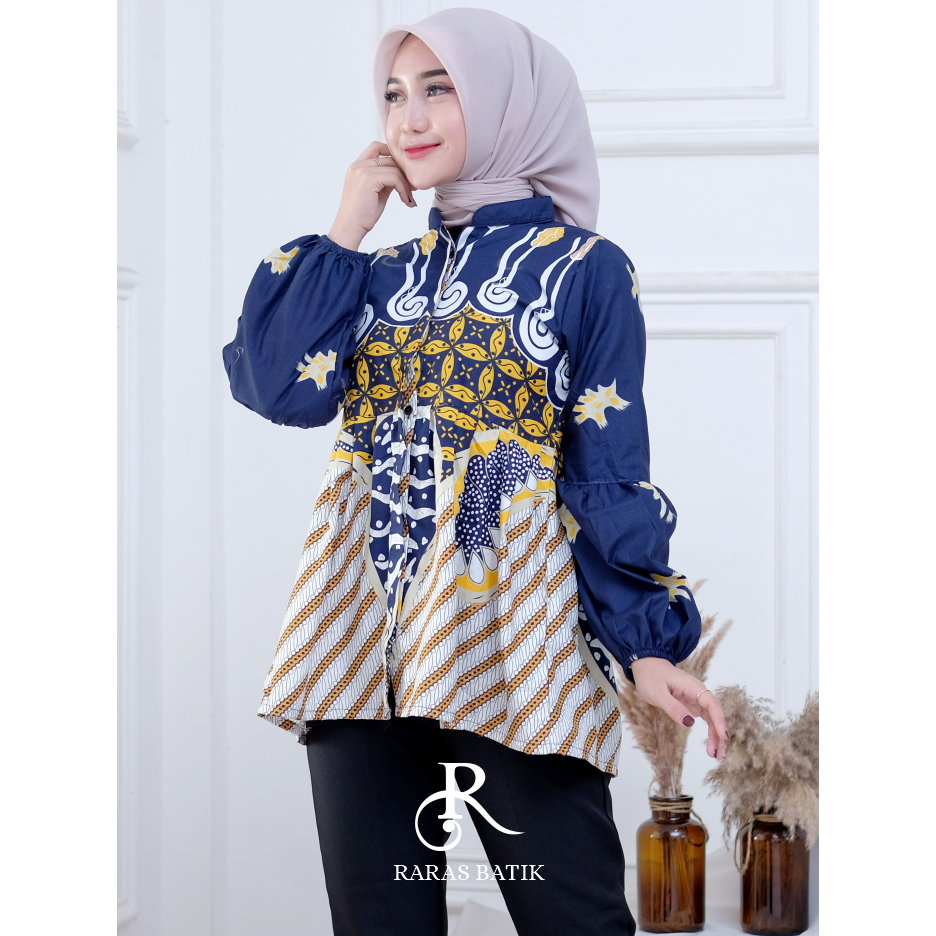 Atasan Baju Batik Wanita Kerja Kantor Modern Blouse Lengan Balon Full Kancing Terbaru Raras Batik