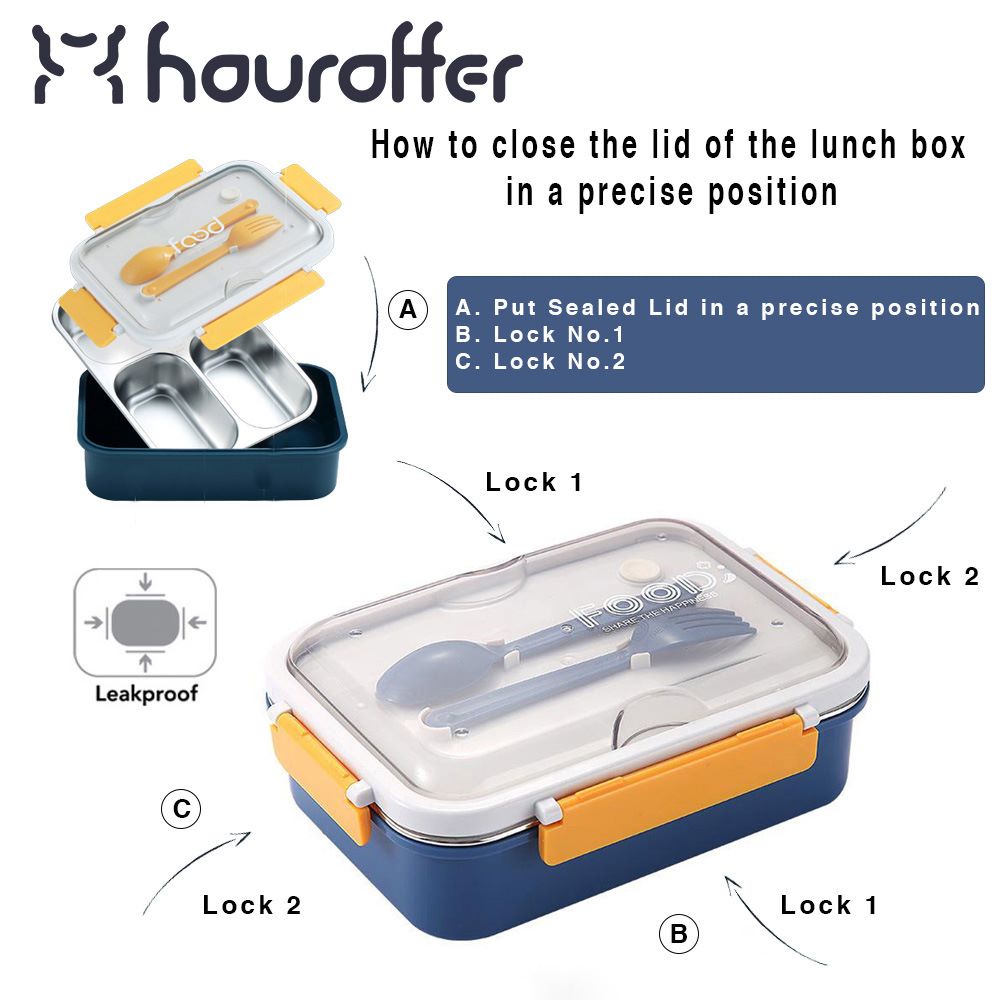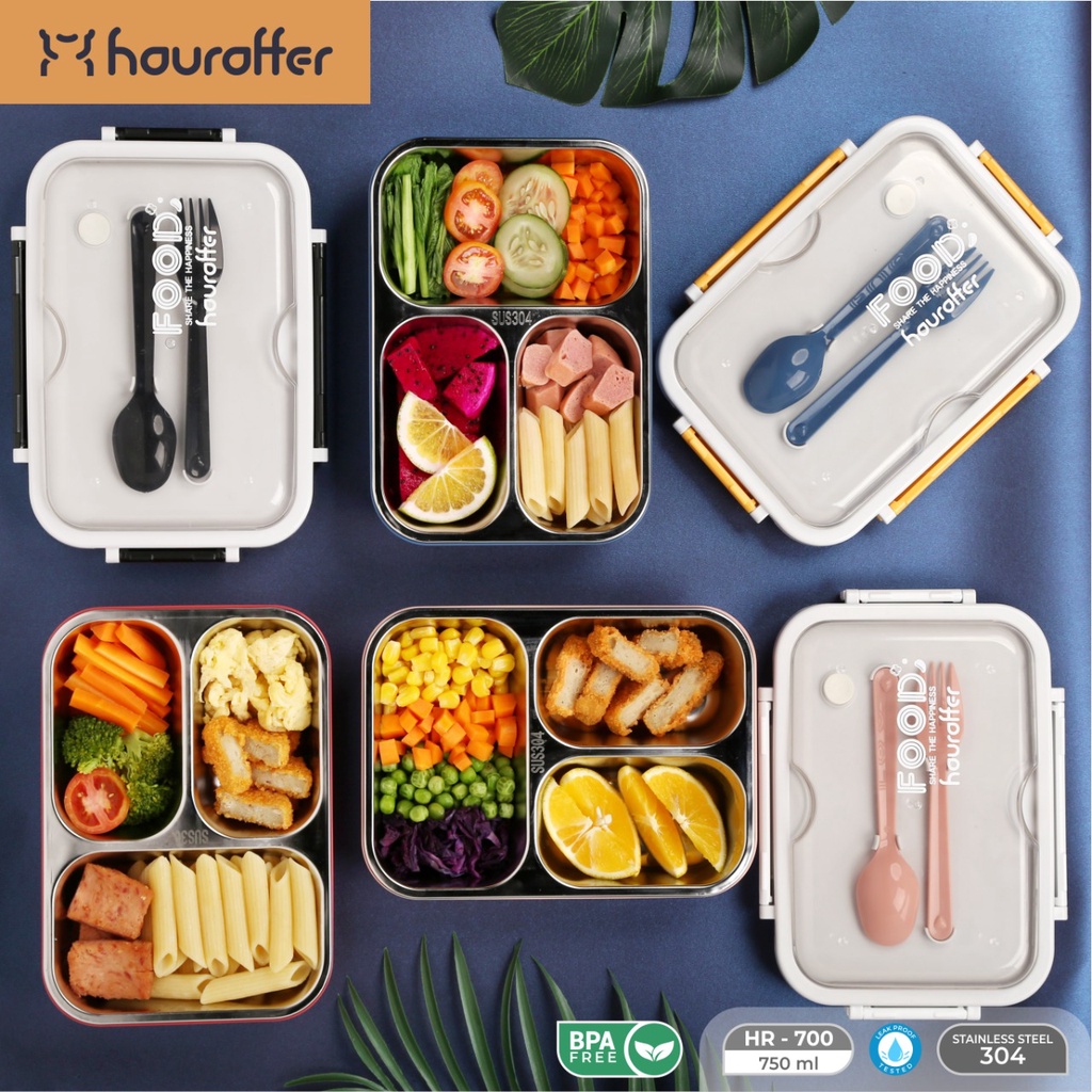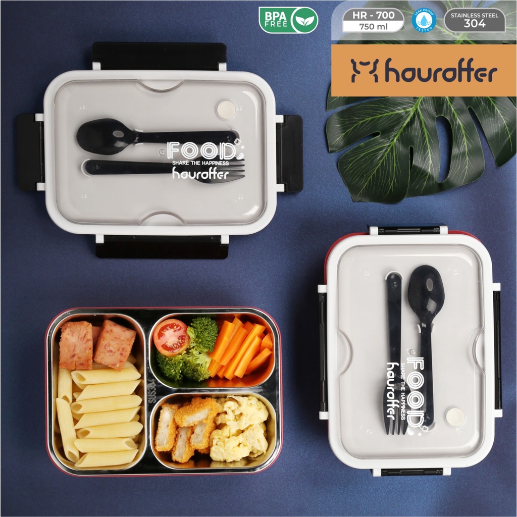Houroffer Kotak Makan Luncbox HR-700 Kotak Bekal 3 Sekat Anti Tumpah 750ml Include Sendok & Garpu