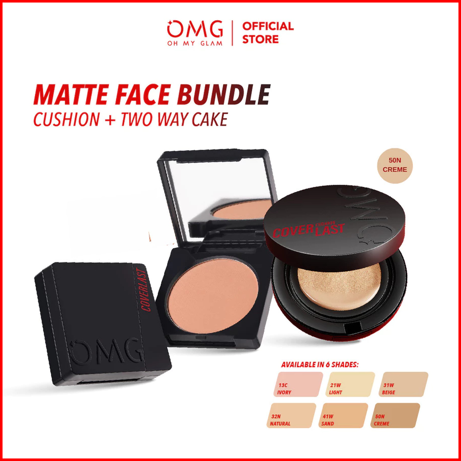 Omg Oh My Glam Glow Matte Face Bundle Oh My Glam Coverlast Cushion Two Way Cake - High Coverage Dewy Finish - Poreless C