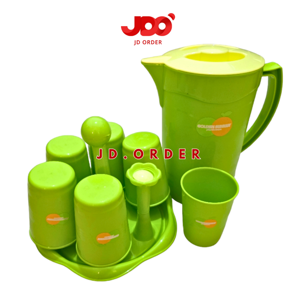 JDO Teko Eskan Plastik Hijau 2.5 Liter Set 6Pcs Gelas dan Tempat Gelas Golden Sunkist