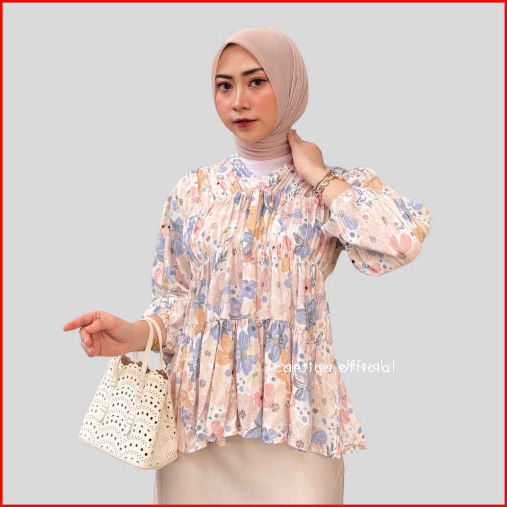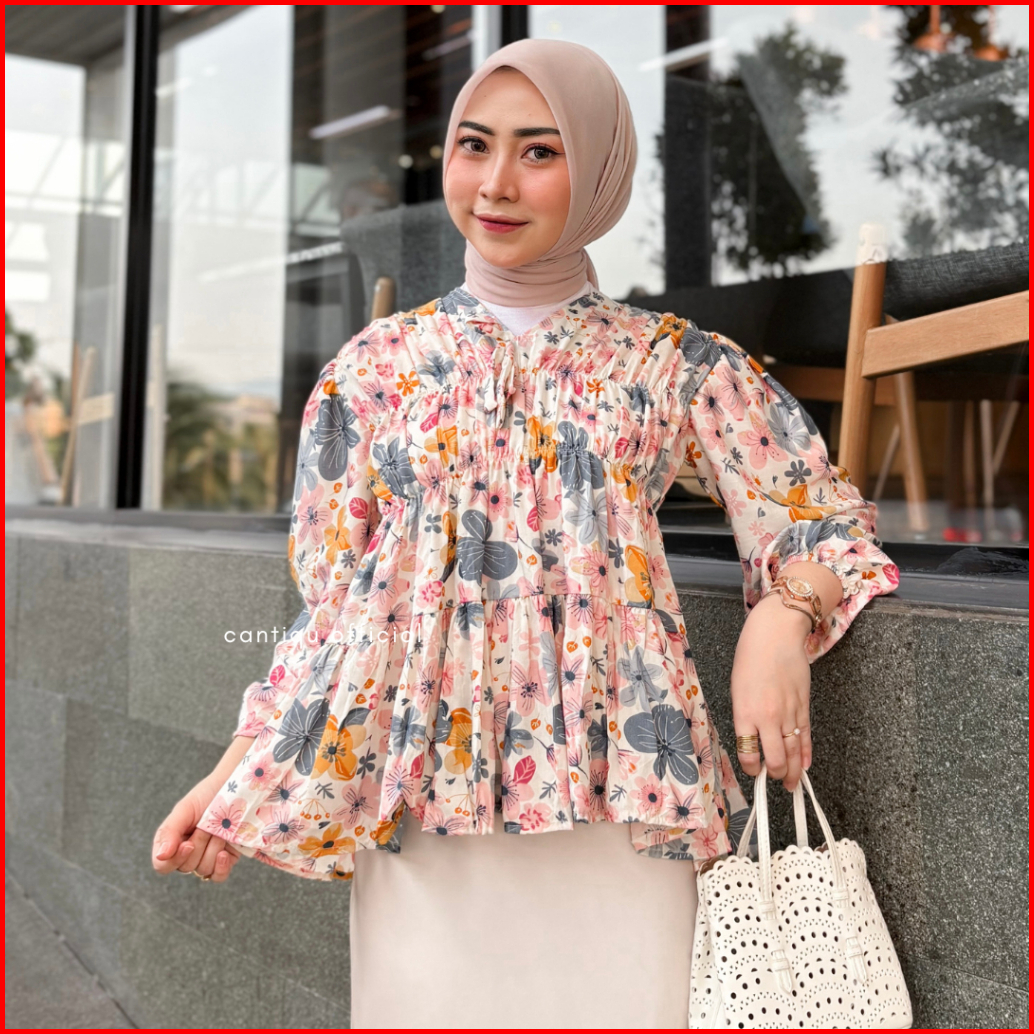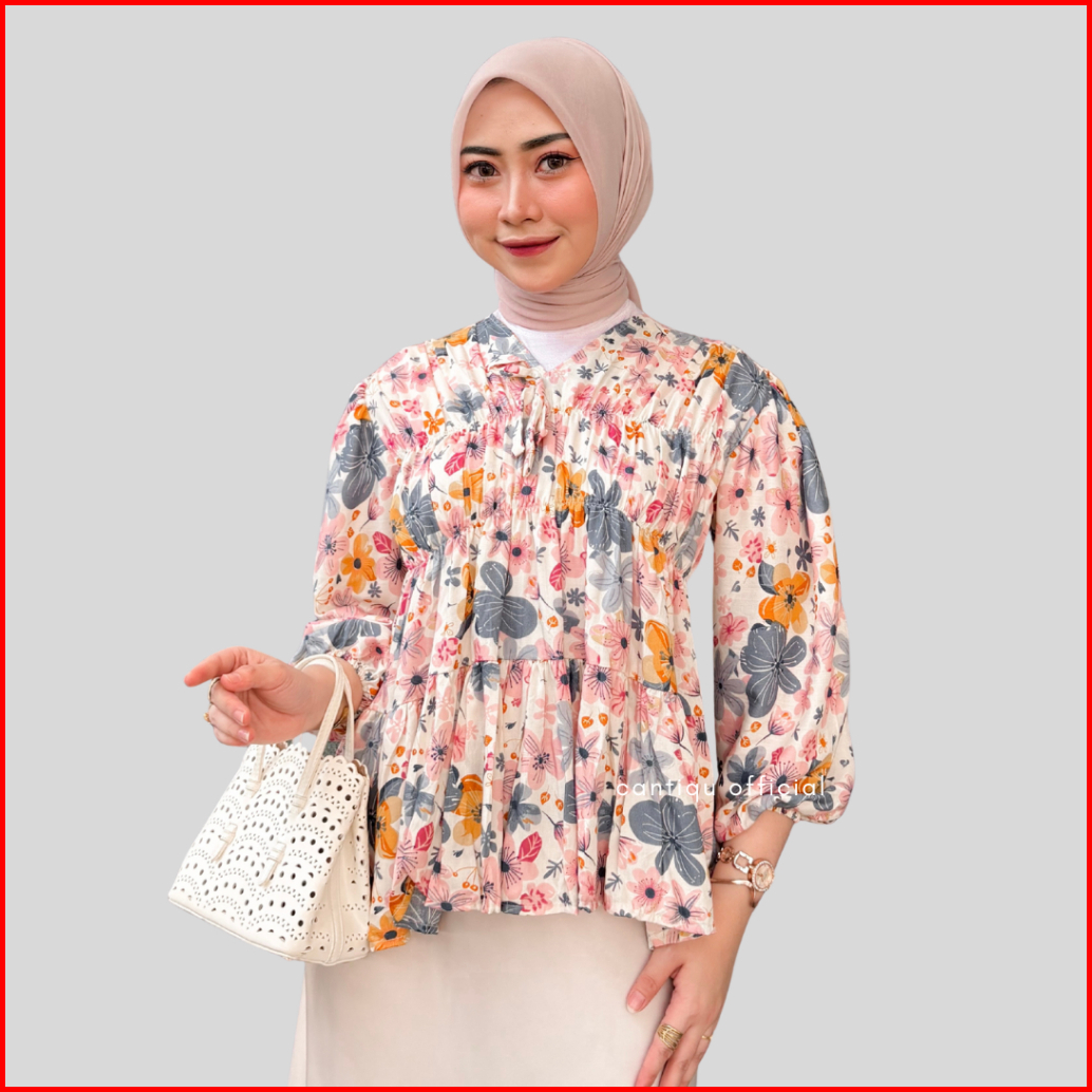 Cantiqu - Mireya Blouse Motif Bunga Atasan Wanita Kerut Dada Bahan Rayontwill