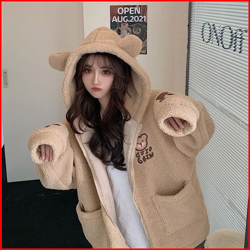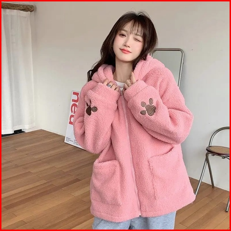 Jaket Sherpa Wanita Gaya Korea Bahan Premium Tebal Jaket Sherpa Hoodie Bulu Wanita Cute Girls