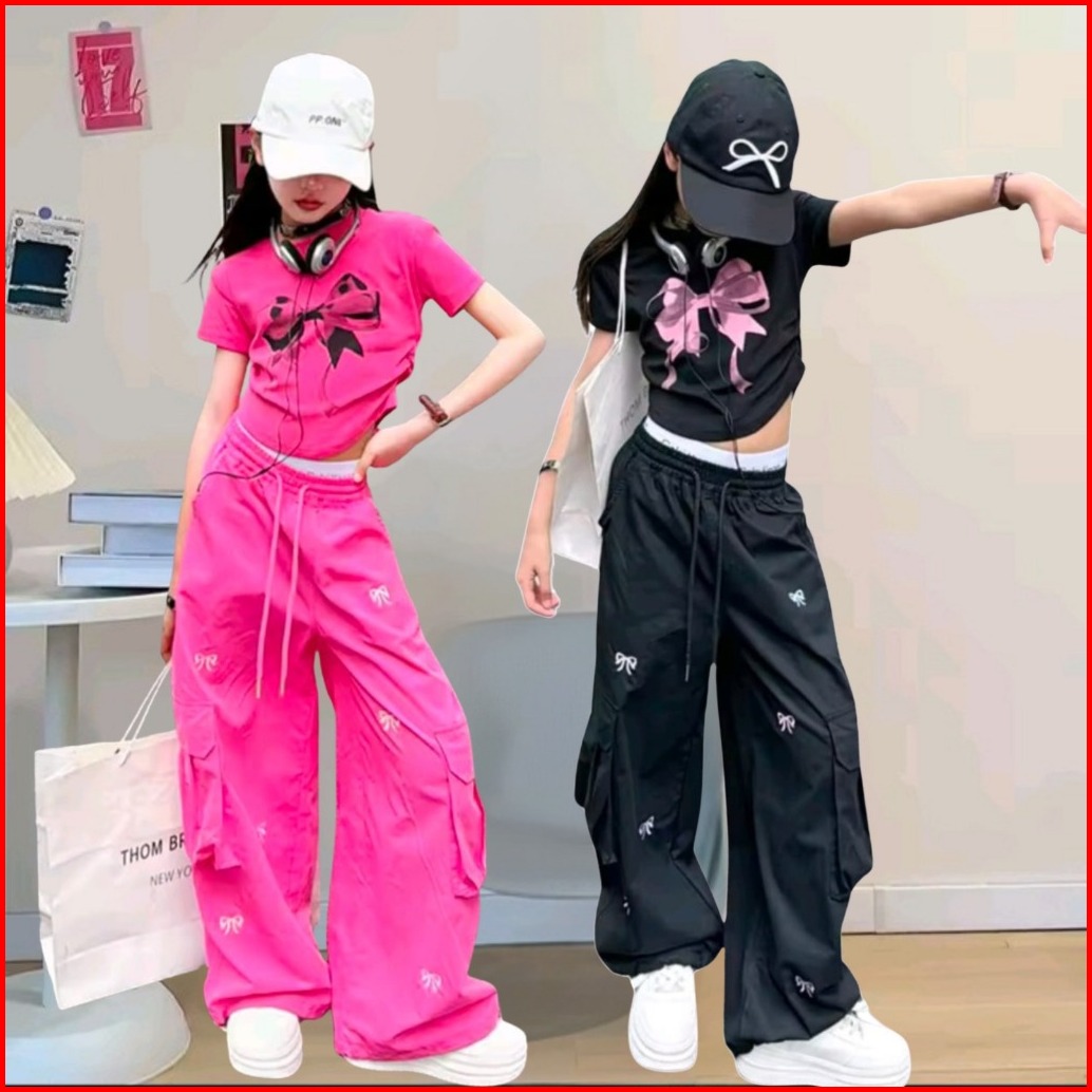 Setelan Anak Perempuan Streetwear Bow Series Cargo Pants Kaos Crop Usia 1-12 Tahun