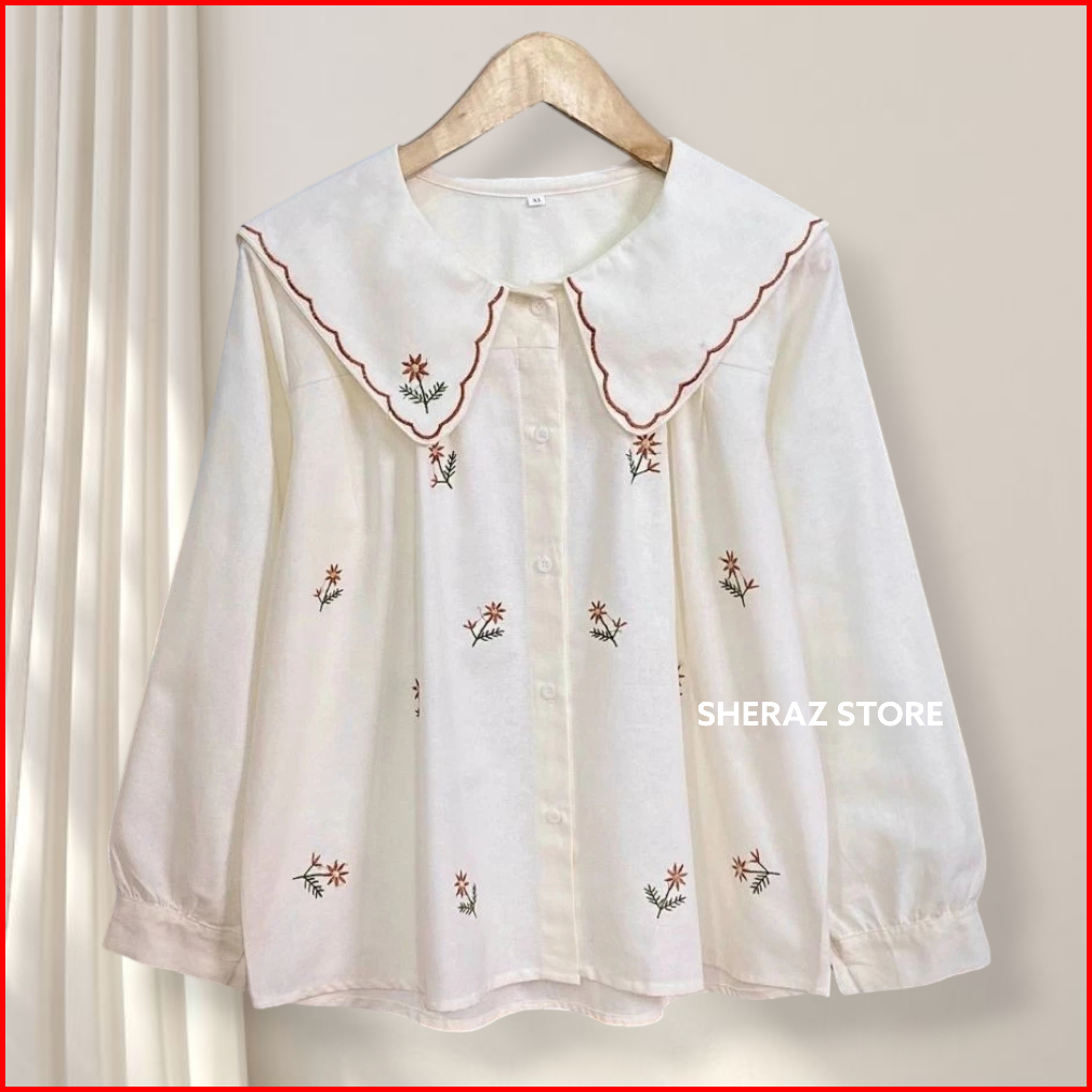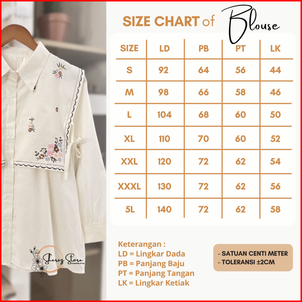 Marina S M L Xl Xxl Atasan Blouse Kemeja Linen Bordir Kekinian Jumbo Ld 120 - 92 Putih Blue Coklat