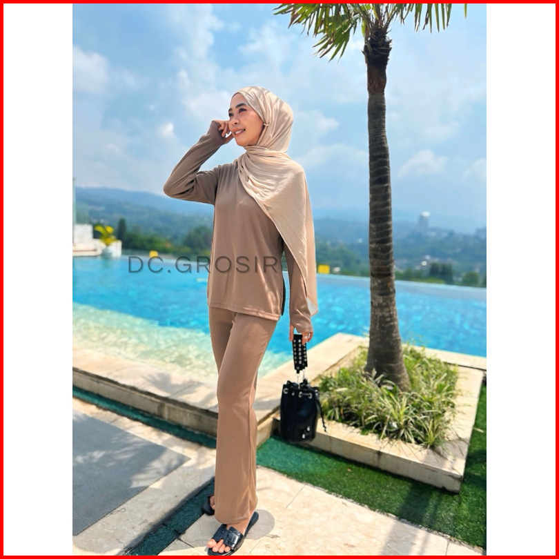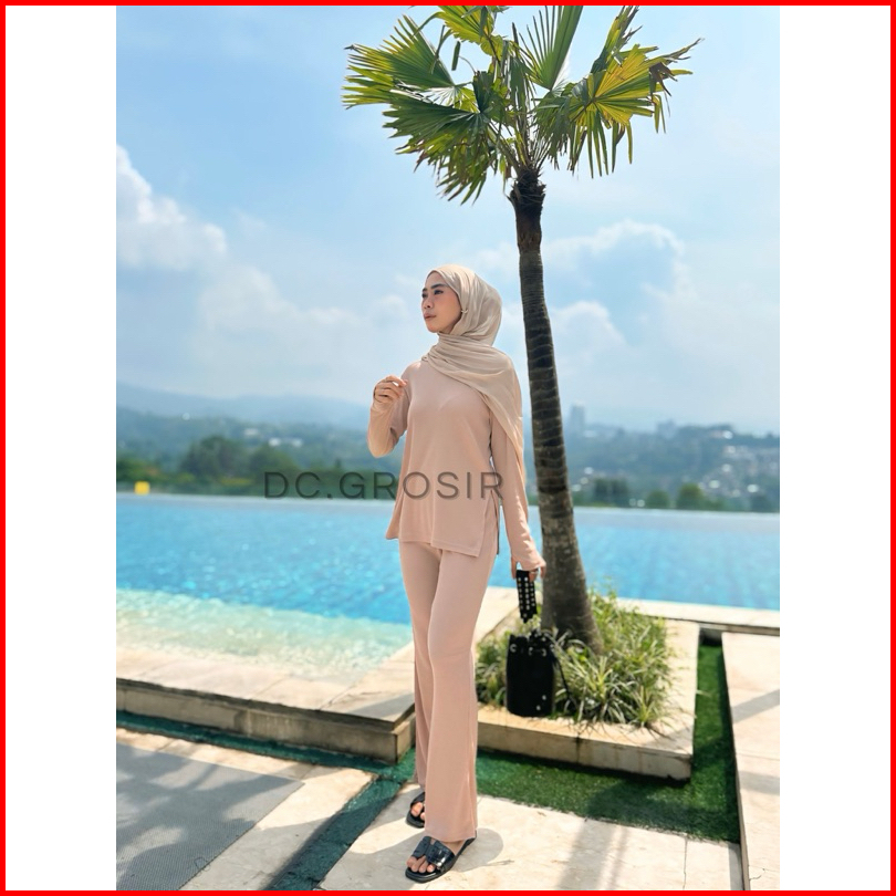 Dc Grosir - Pene Set Setelan Wanita Oneset Lengan Panjang Knit Rib Shirt Pants Baju Set Celana Highwaist Atasan