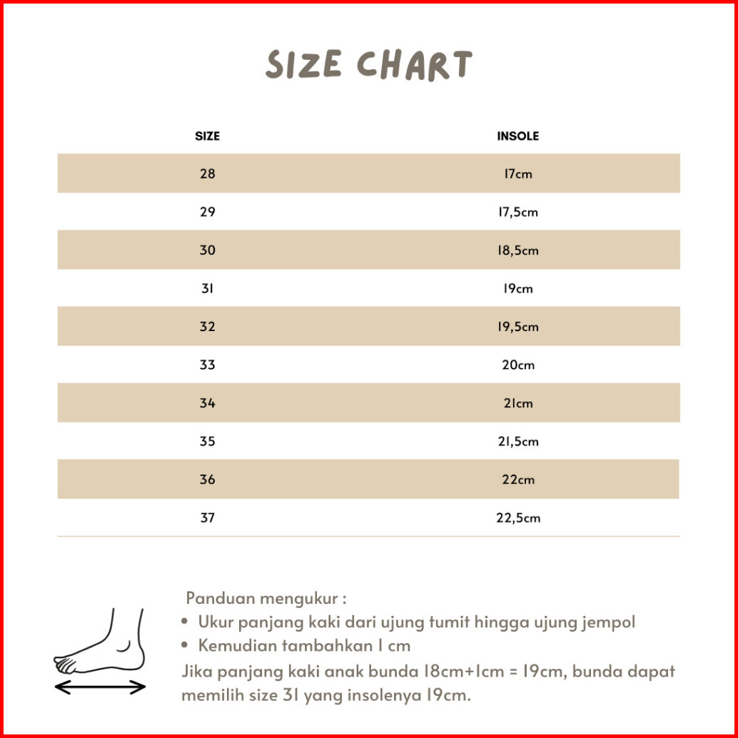SIZE 28 (17cm), SIZE 29 (17,5cm), SIZE 30 (18,5cm), SIZE 31 (19cm), SIZE 32 (19,5cm), SIZE 33 (20cm), SIZE 34 (21cm), SIZE 35 (21,5cm), SIZE 36 (22cm), SIZE 37 (22,5cm)
