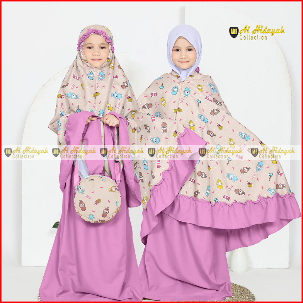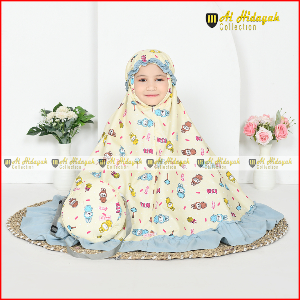 Mukena Anak Karakter Labubu Lucu Resleting Dagu 2 Sampai 13 Tahun Tas Selempang Katun Premium Mukenah Balita Batita Paud