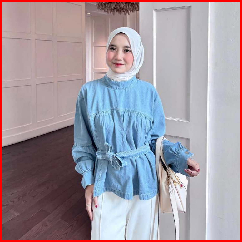 Pola Wear Blouse Denim Wanita Look Korean Style Atasan Jeans Casual Modis Ikat Pinggang Farra