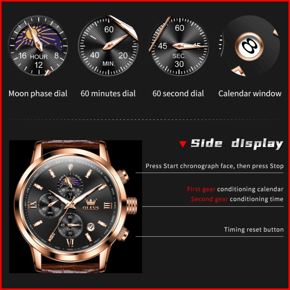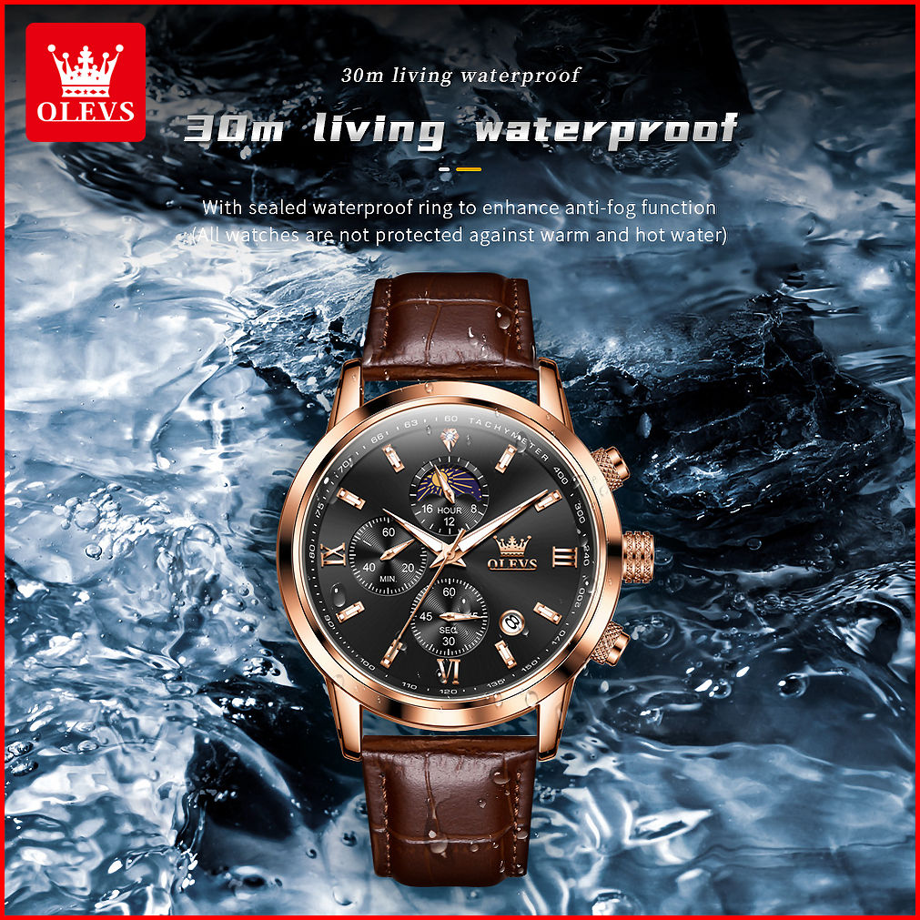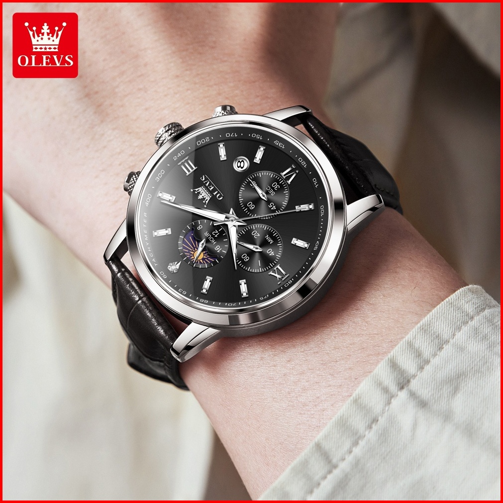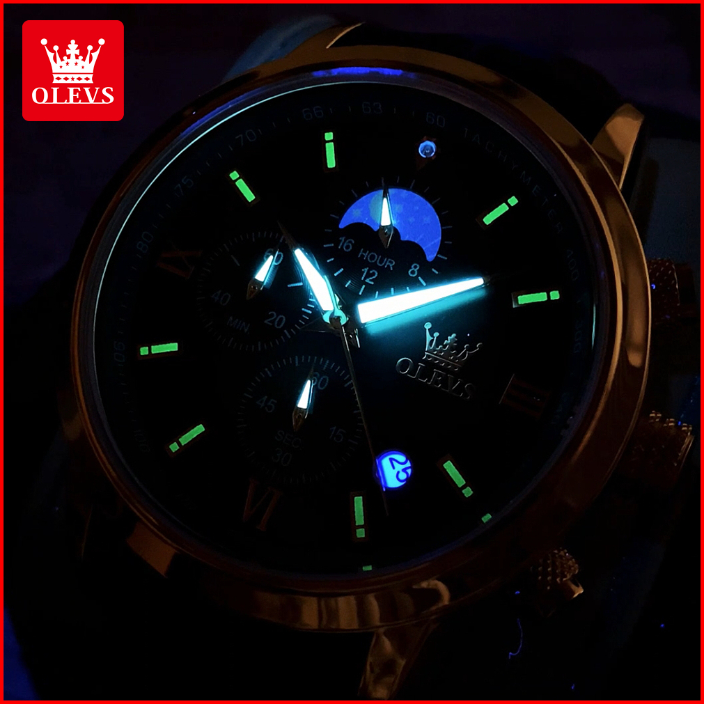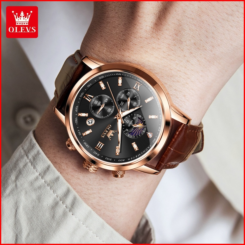 Olevs Jam Tangan Pria Anti Air Original 100 Mewah Tali Kulit Chronograph Luminous Analog Watch Men Model 9812
