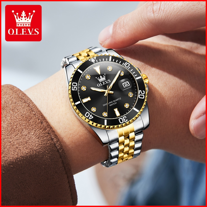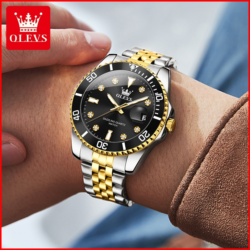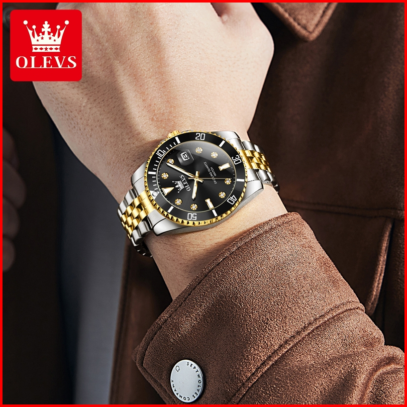 Olevs Jam Tangan Pria Anti Air Original Stainless Steel Mewah Bisnis Luminous Kalender Analog Hitam Watch Men 9809