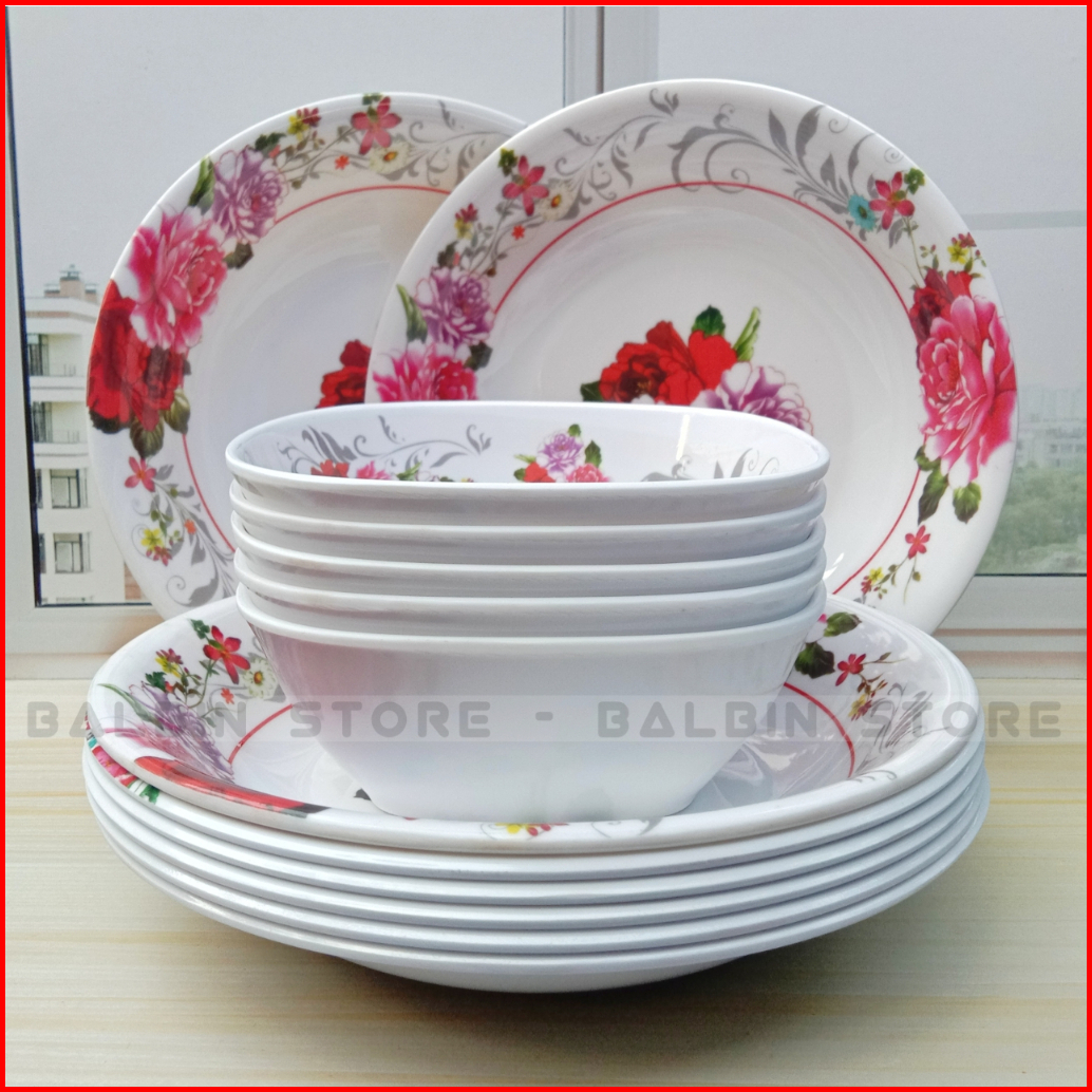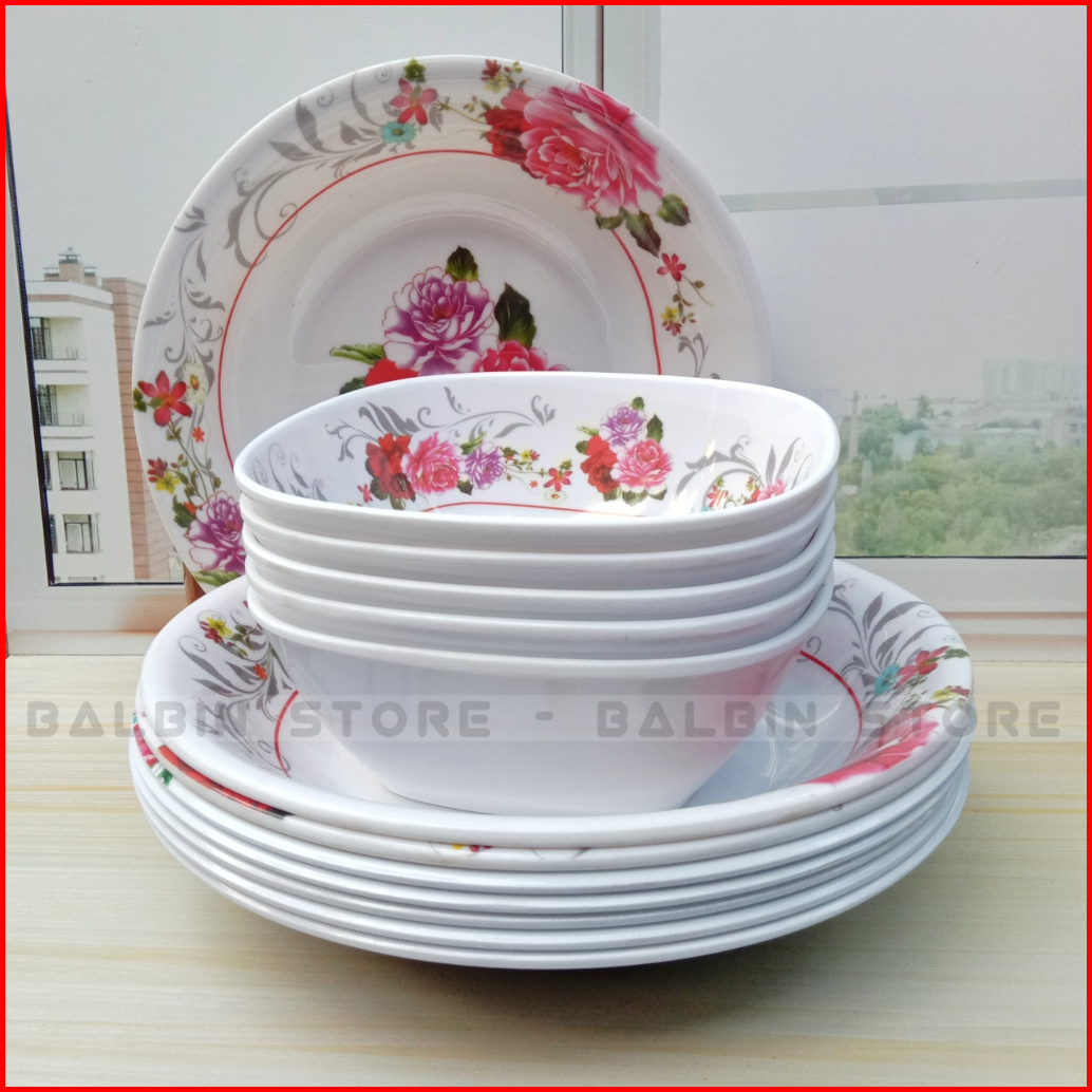 Promo 12.pcs Isi Piring Melamine Uk.23 Cm Dan Mangkuk Melamine Uk.15 Cm Motif Kembang Bahan Melamin Kualitas Sni