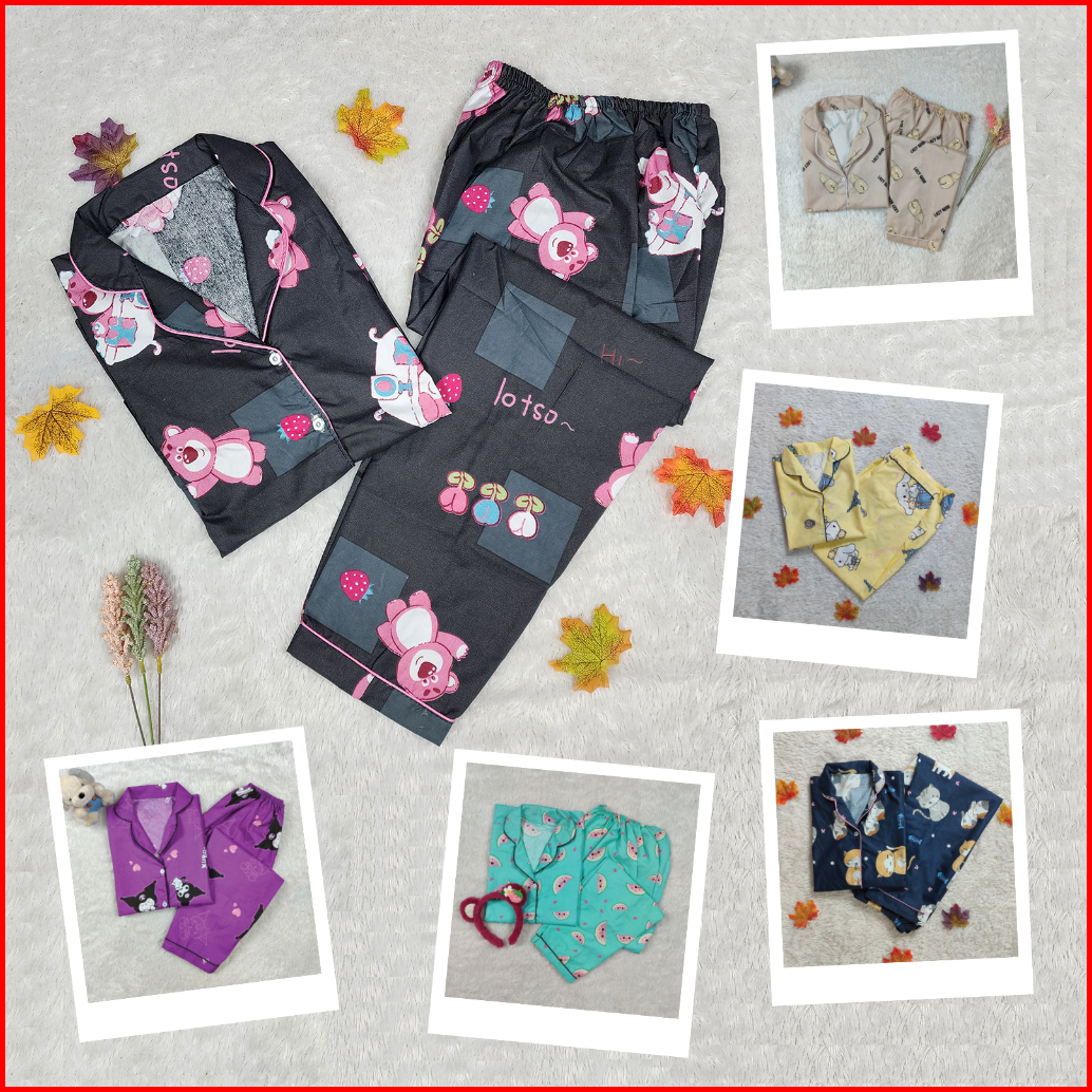 Lotso Pink, Lotso Hitam, Lazy Bear Abu, Lazy Bear Mocca, Lotso pink muda, Lotso biru, Kuromi Magenta, Kuromi Ungu, Dino Hijau, Dino Pink, Little Chics Abu, Little Chics Coklat, Cat cream, Cat navy, Star Moon Hitam, Star Moon merah, Cinnamoroll Kuning, Cinnamoroll Navy, Cinamonroll Merah, Pocacho Hijau, Pocacho Biru, Bunga Ungu, Bunga Biru, Daun Navy, Daun Maroon, Kotak Merah, Kotak Navy, Kotak Coklat, Kotak Pink, Watermelon Tosca, Watermelon Pink, Little Bee Coklat, Little Bee Abu, Embos Hijau, Embos Hitam, Embos Pink, Embos Maroon, Embos Navy, Emboss Abu Tua, Embos Coksu, Embos Abu Muda, Embos Coklat, Celana Tidur Random, Baju aja random, Embos Ungu, Embos kuning