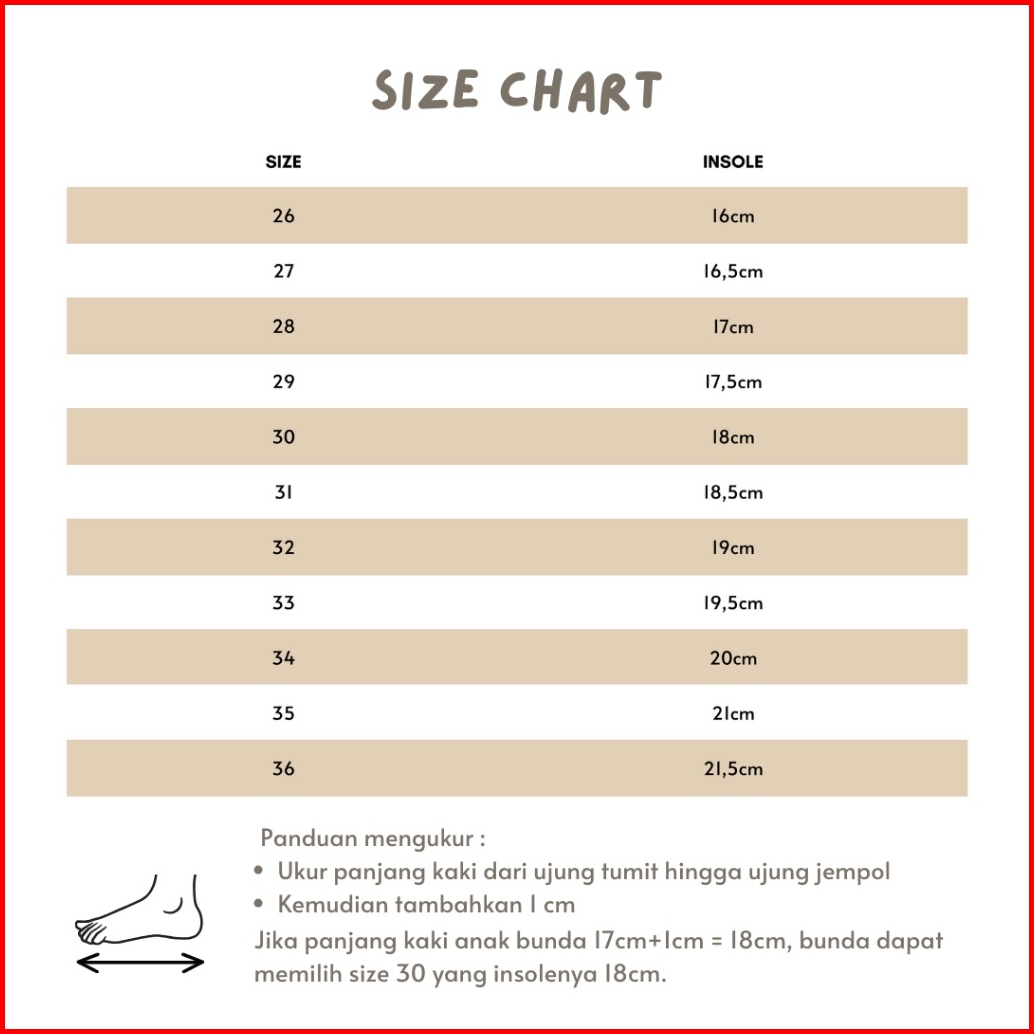 Size 26 (16cm), Size 27 (16,5cm), Size 28 (17cm), Size 29 (17,5cm), Size 30 (18cm), Size 31 (18,5cm), Size 32 (19cm), Size 33 (19,5cm), Size 34 (20cm), Size 35 (21cm), Size 36 (21,5cm)