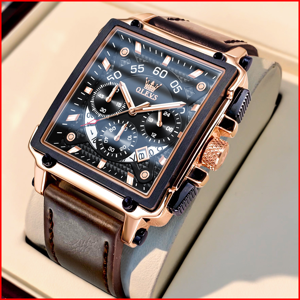 Olevs Jam Tangan Pria Kulit Anti Air Original Asli Terbaru Casual Tahan Air Square Chronograph Leather Dengan Kotak Tang