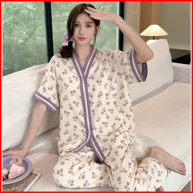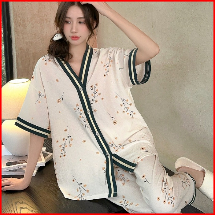 Piyama Tanpa Ac Bahan Kapas Gelembung Piyama Celana Panjang 1 Set Piyama Kancing Piyama Tidur Wanita