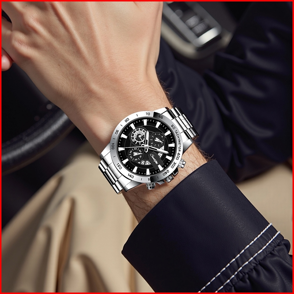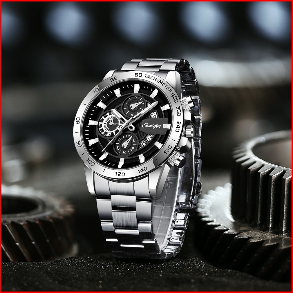 Sunlifex Jam Tangan Pria Quartz Kalender Bercahaya Olahraga Tali Stainless Steel Jam Tangan Cowok Sl3321