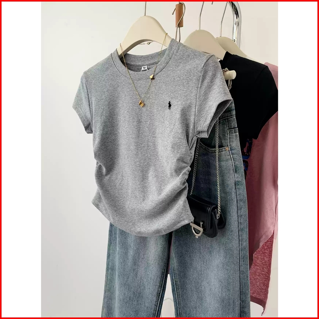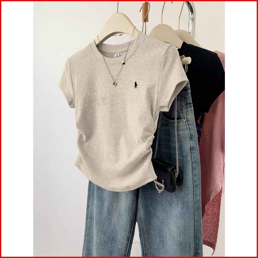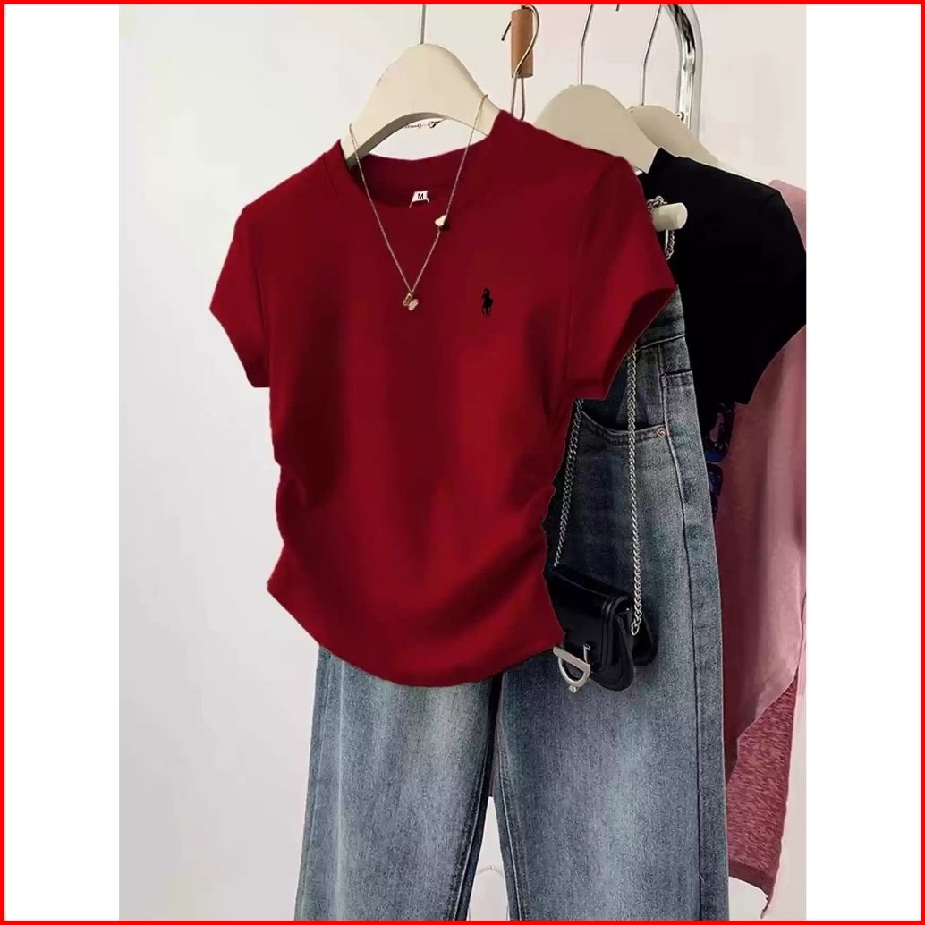 Anggur Merah Kaos Lengan Pendek Wanita Musim Panas Bermotif Printing Pendek Pakaian Round Neck Slim-fit Top Atasan Baju