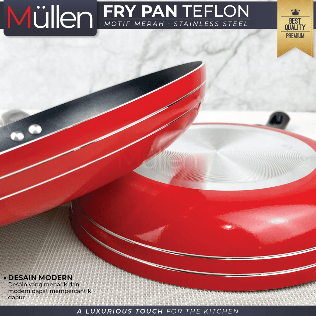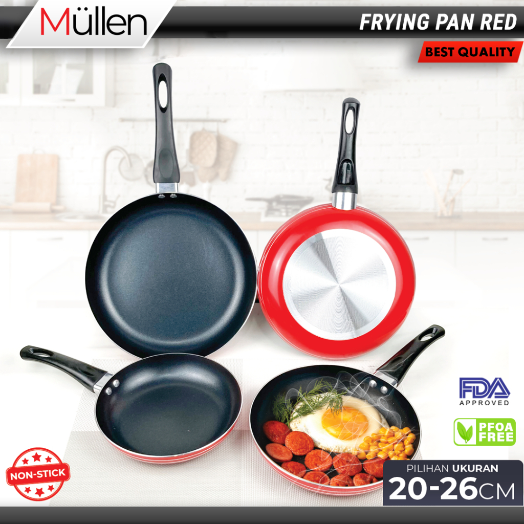Mullen Fry Pan Red Teflon Wajan Penggorengan Anti Lengket Kitchenware Frypan Stainless Non Stick Gagang Bakelite 20/22/24/26 CM
