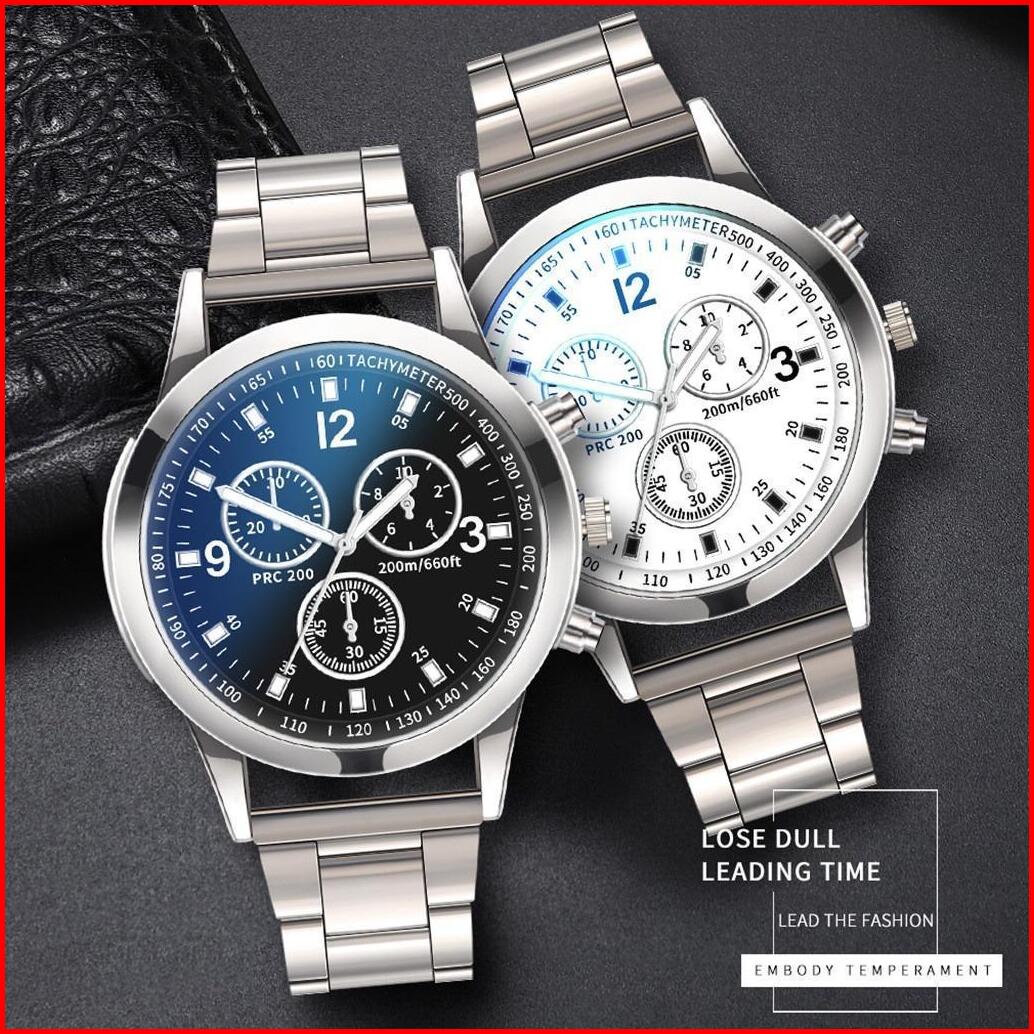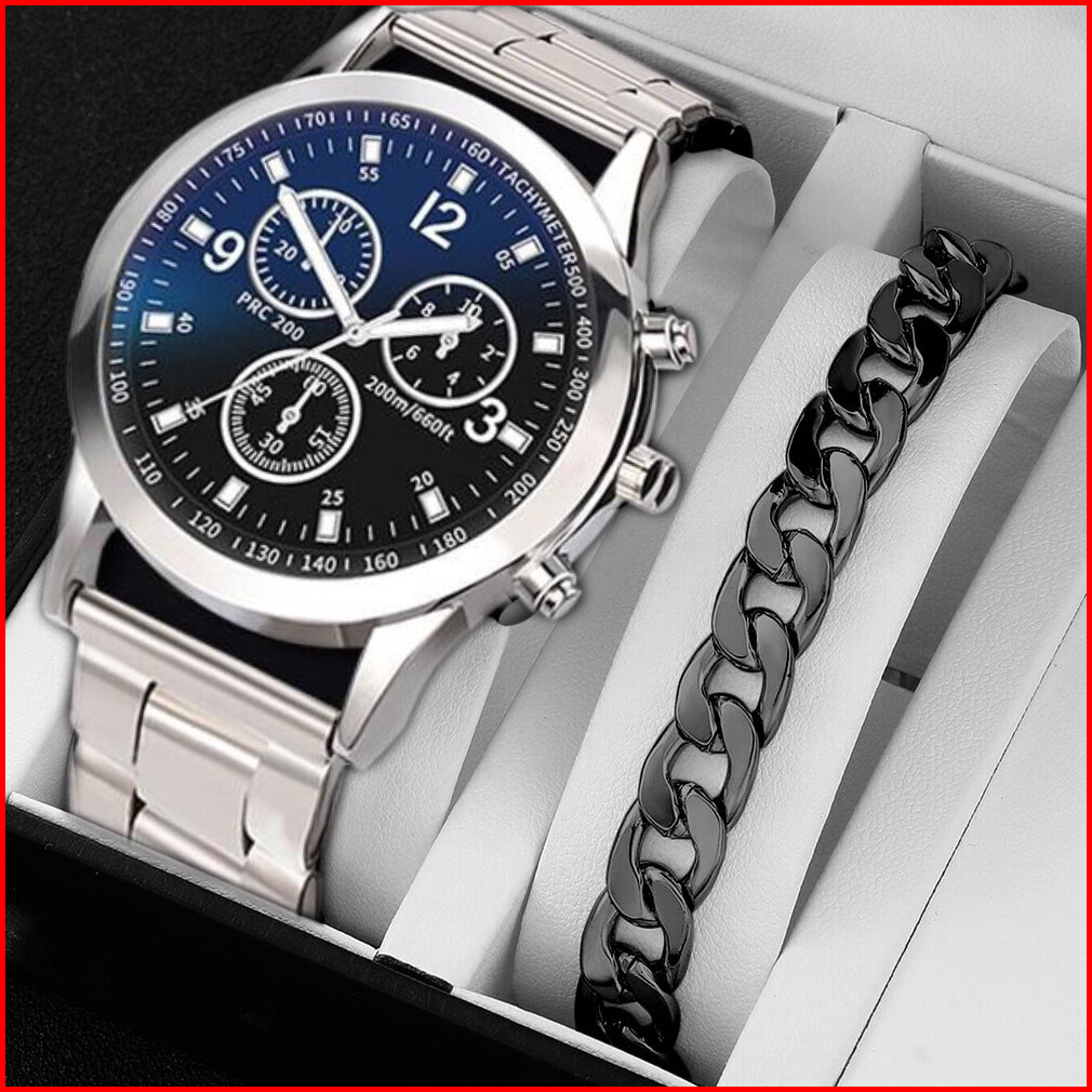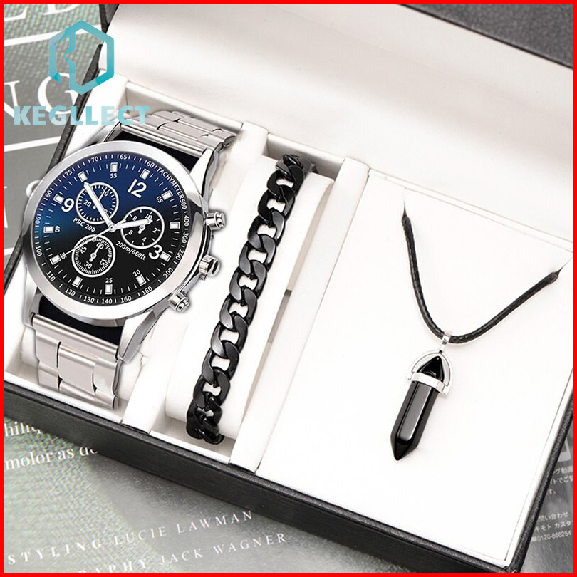3pcs Jam Tangan Kuarsa Gaya Bisnis Pria Tali Baja Tahan Karat Dial Besar Dengan Aksesori