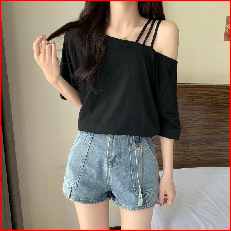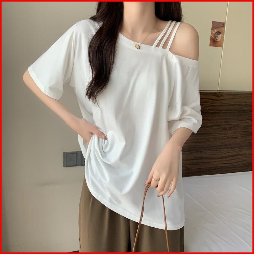 T-shirt Lengan Pendek Tali Bahu Off-shoulder Atasan Longgar Tipis Musim Panas Awet Muda 2430