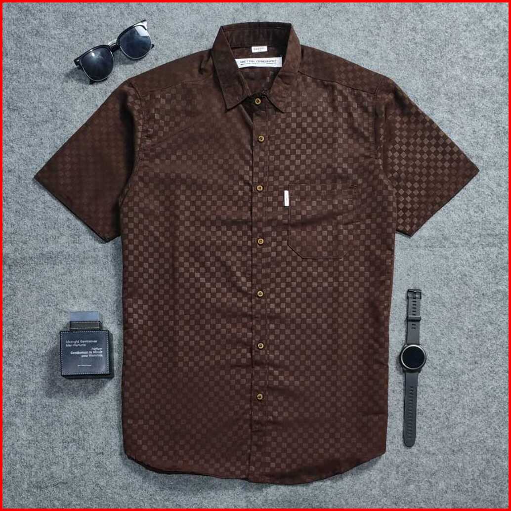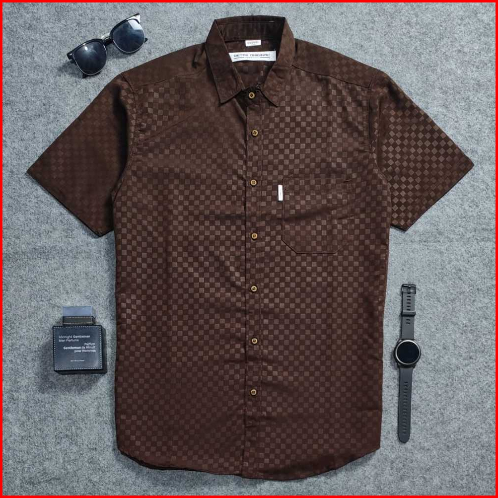 Detak Original Kemeja Embos Sultan Pria Lengan Pendek Coklat Chessboard Casual Slimfit