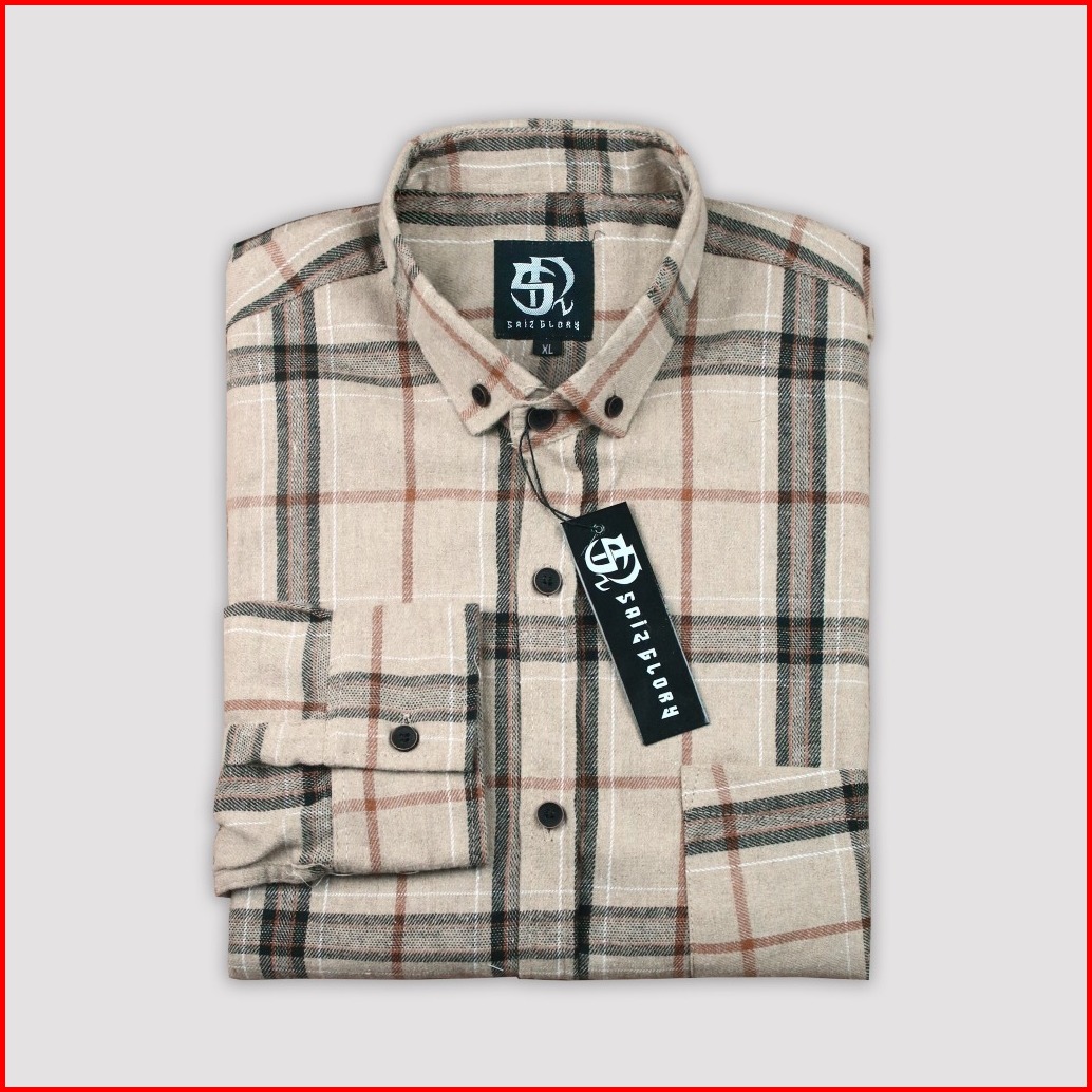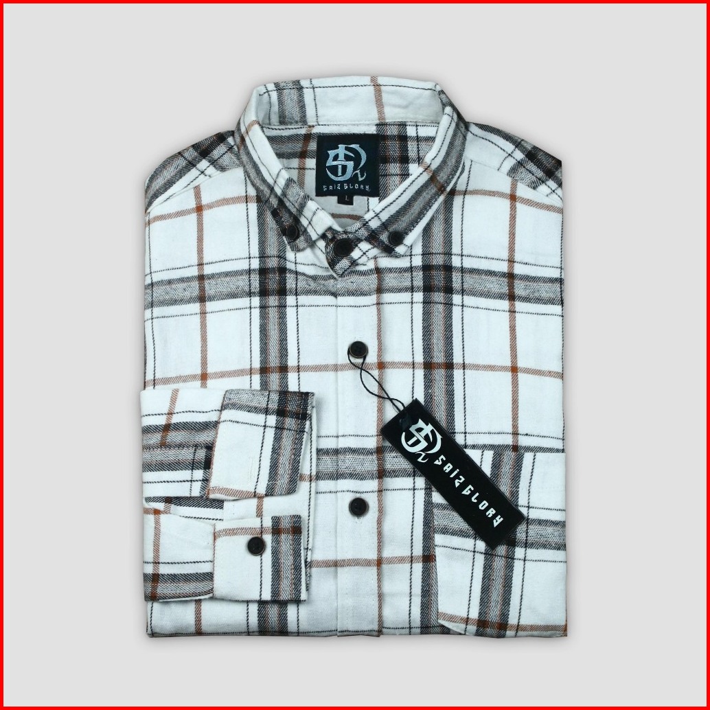 Saiz Glory Kemeja Flanel Pria Lengan Panjang Motif Korean Krem White Liner
