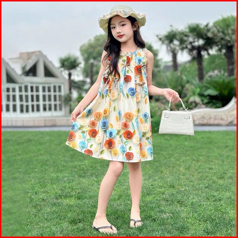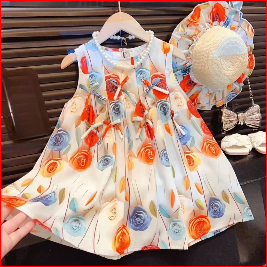 Kidsfashionkoleksi 1085 Dress Blisha Floral Motif Pita Pita Sleeveless Topi Pantai Senada Anak Perempuan