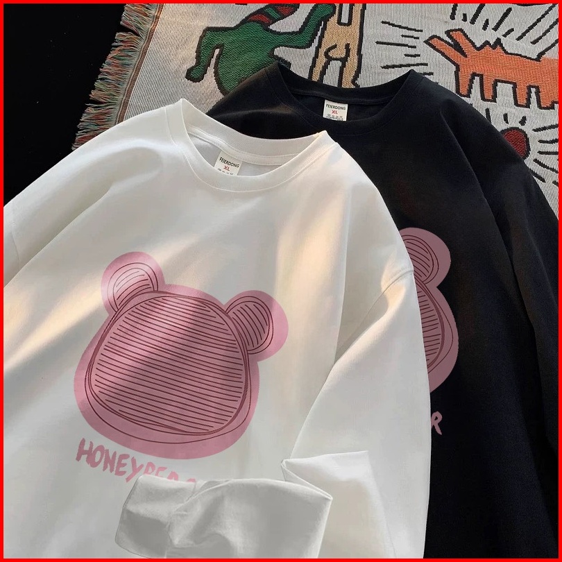 Forteid Atasan Kaos Wanita Oversize Lengan Panjang Korean Style Beruang Lucu Berwarna Merah Muda Lucu Baju Kaos Polos Co