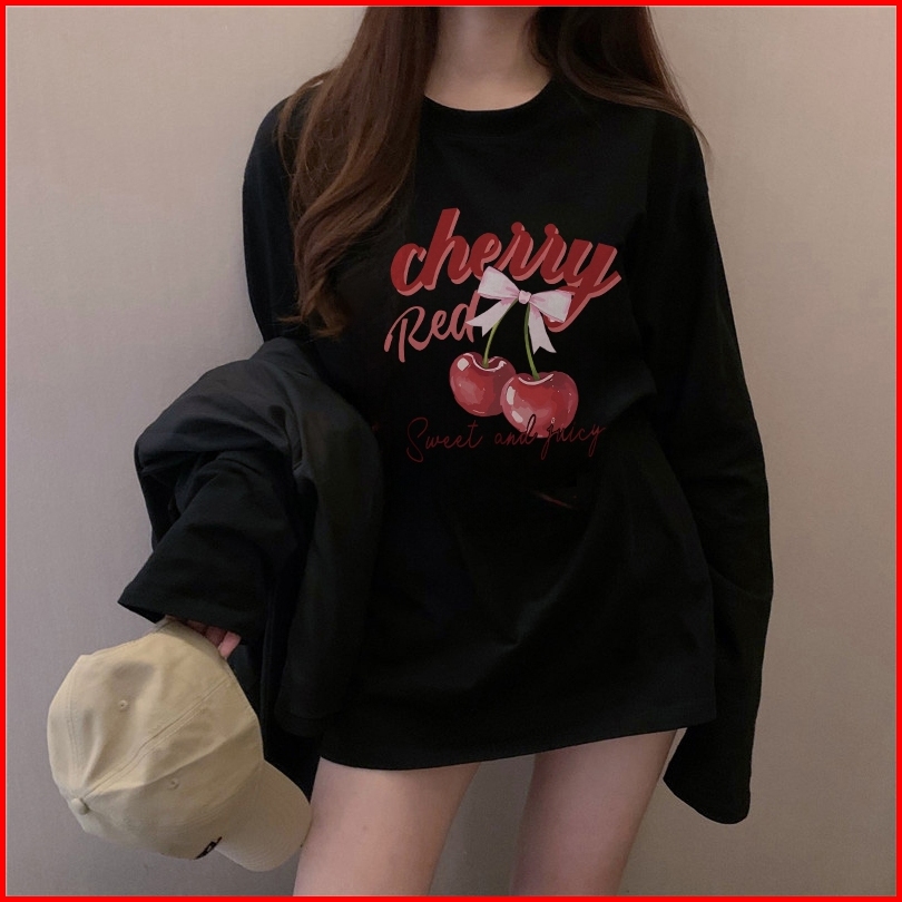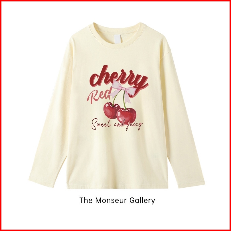 The Monseur Gallery Baju Kaos Wanita Lengan Panjang Kaos Oversize Wanita Baju Atasan Wanita Red Cherry Kaos Wanita Cream