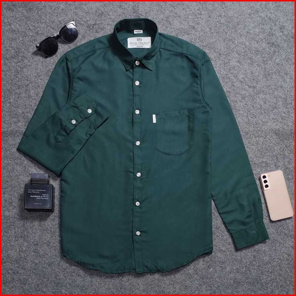 Detak Original Kemeja Polos Pria Lengan Panjang Polymicro Hijau Botol Casual Slimfit
