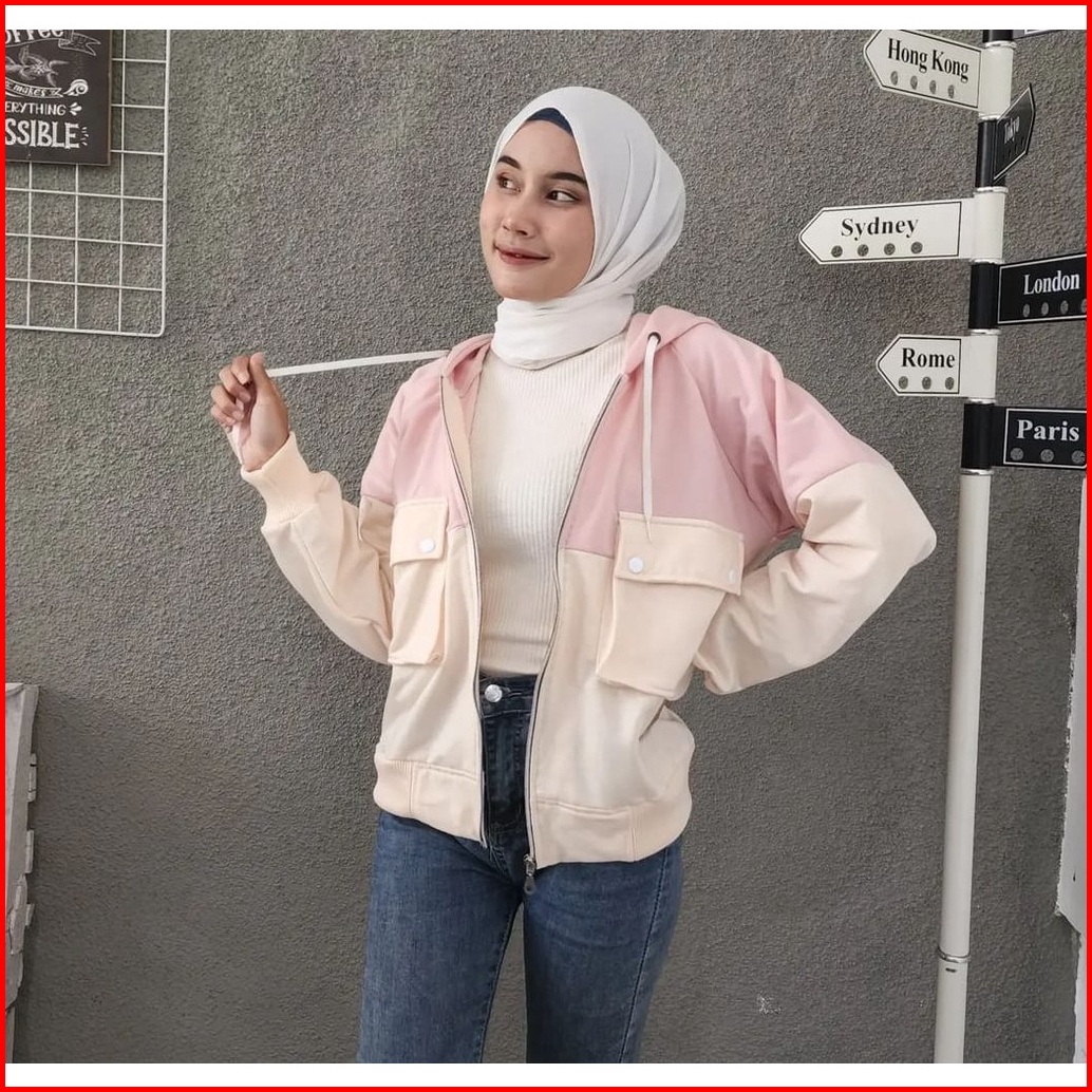 Two Tone Jacket Pocket Wanita Sweater Jaket Oversize Combine