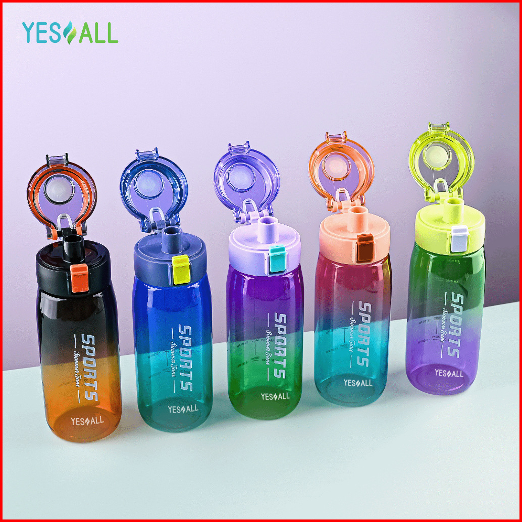 Yesall 600ml Botol Minum Pelangi Motivasi Gradasi - Tutup Flip Thumbler Penanda Waktu Gradiasi Rainbow Warna Transparan