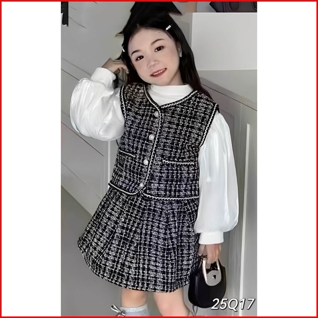 Setelan Tweed Anak Perempuan Usia 1-4 Tahun Baju Katun Lengan Panjang Balon Tile Satin Kombinasi Outer Rompi Tweed Full