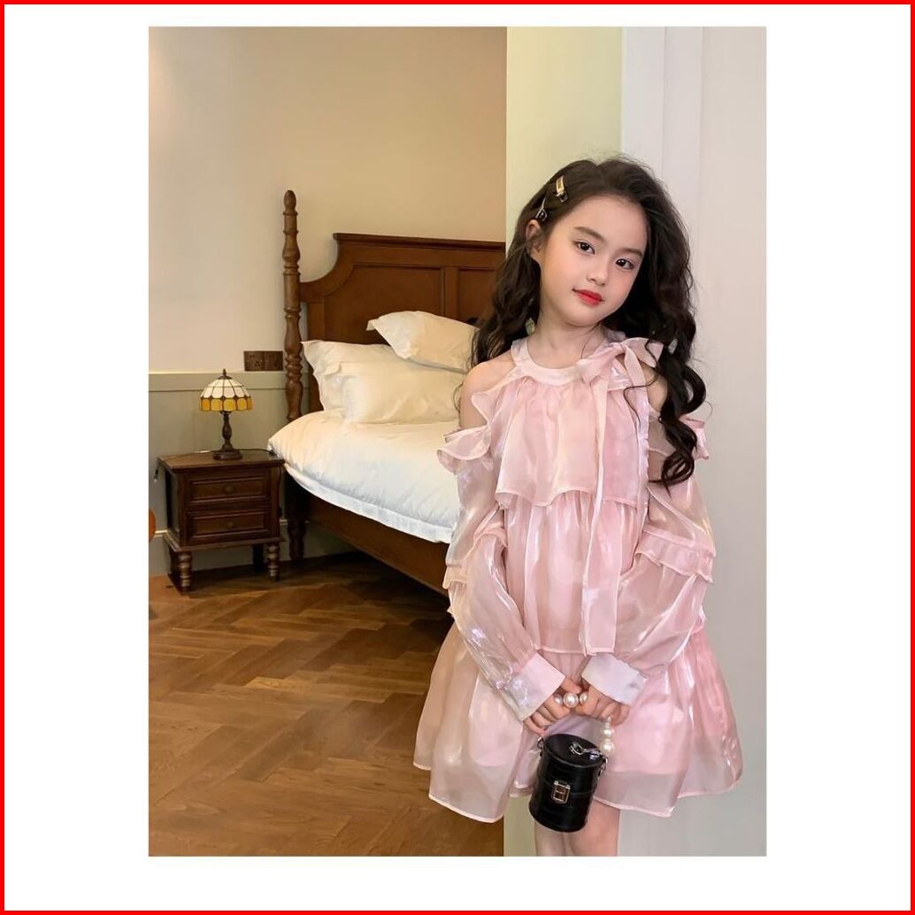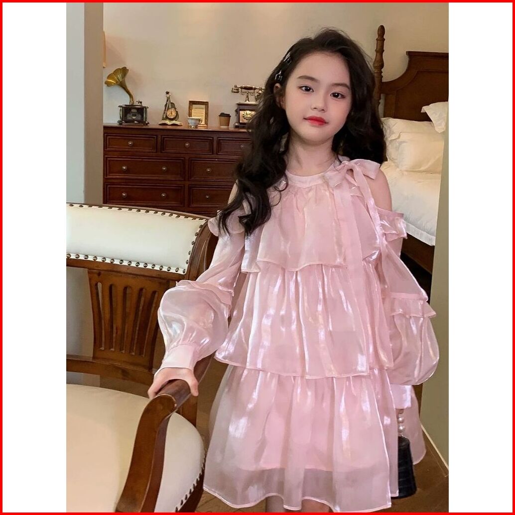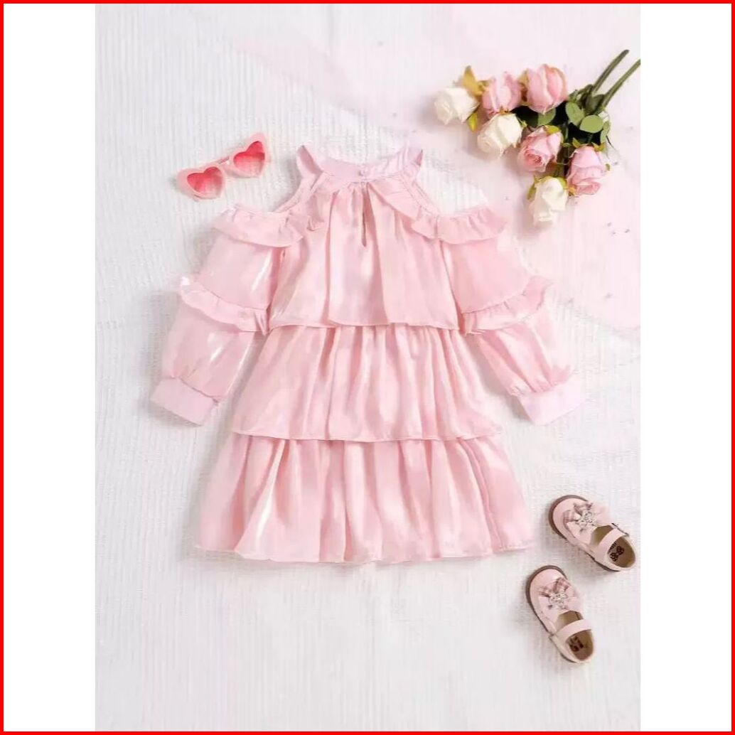 Kidsfashionkoleksi 1074 Dress Layer Castle Silk Pink Ribbon Model Off Shoulder Anak Perempuan