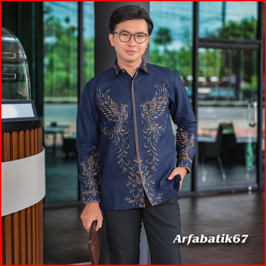 Phoniex Navy Kemeja Batik Smock Bordir Pria Katun Prima Premium Lengan Panjang Lapis Full Furing Trikot Wafle Full Sampa