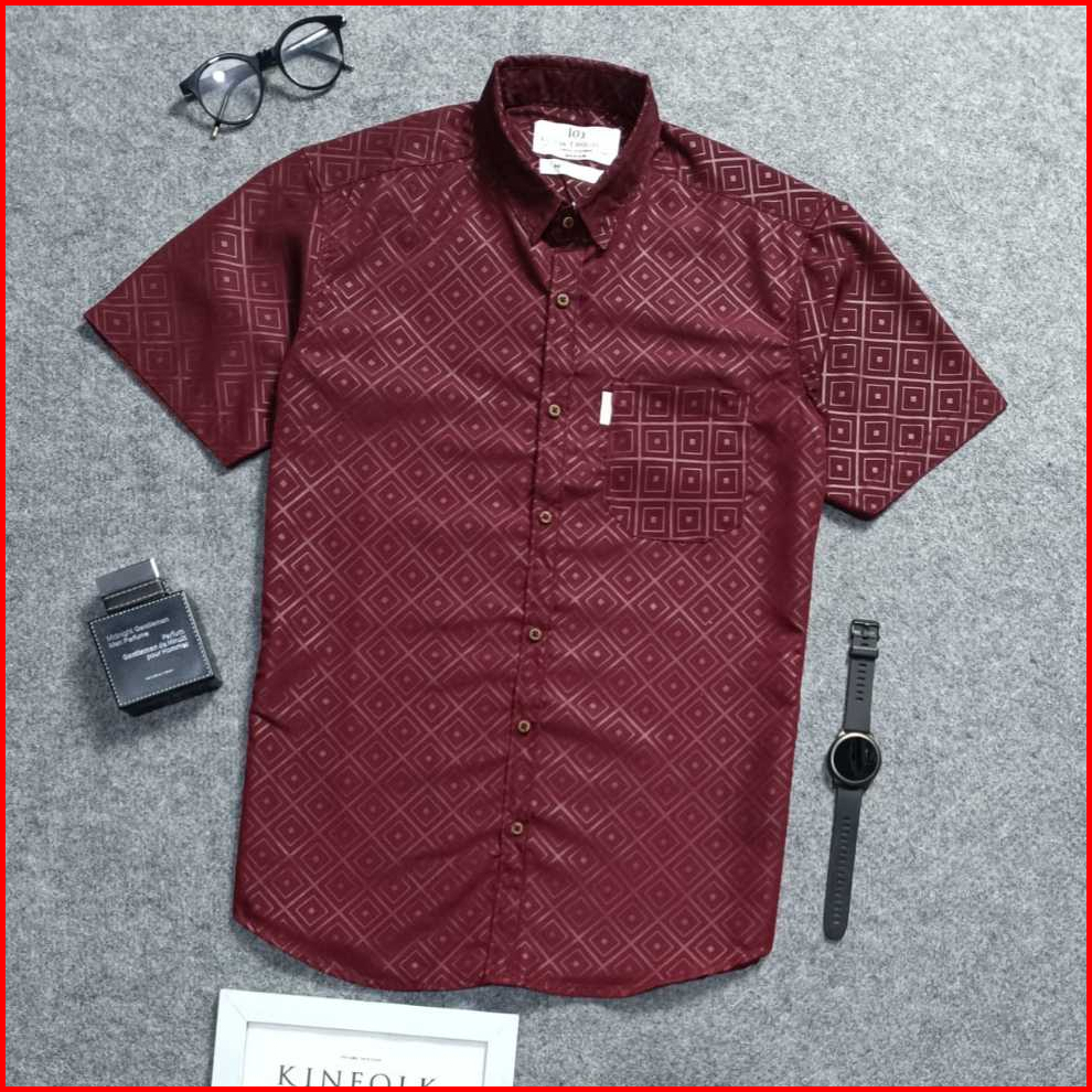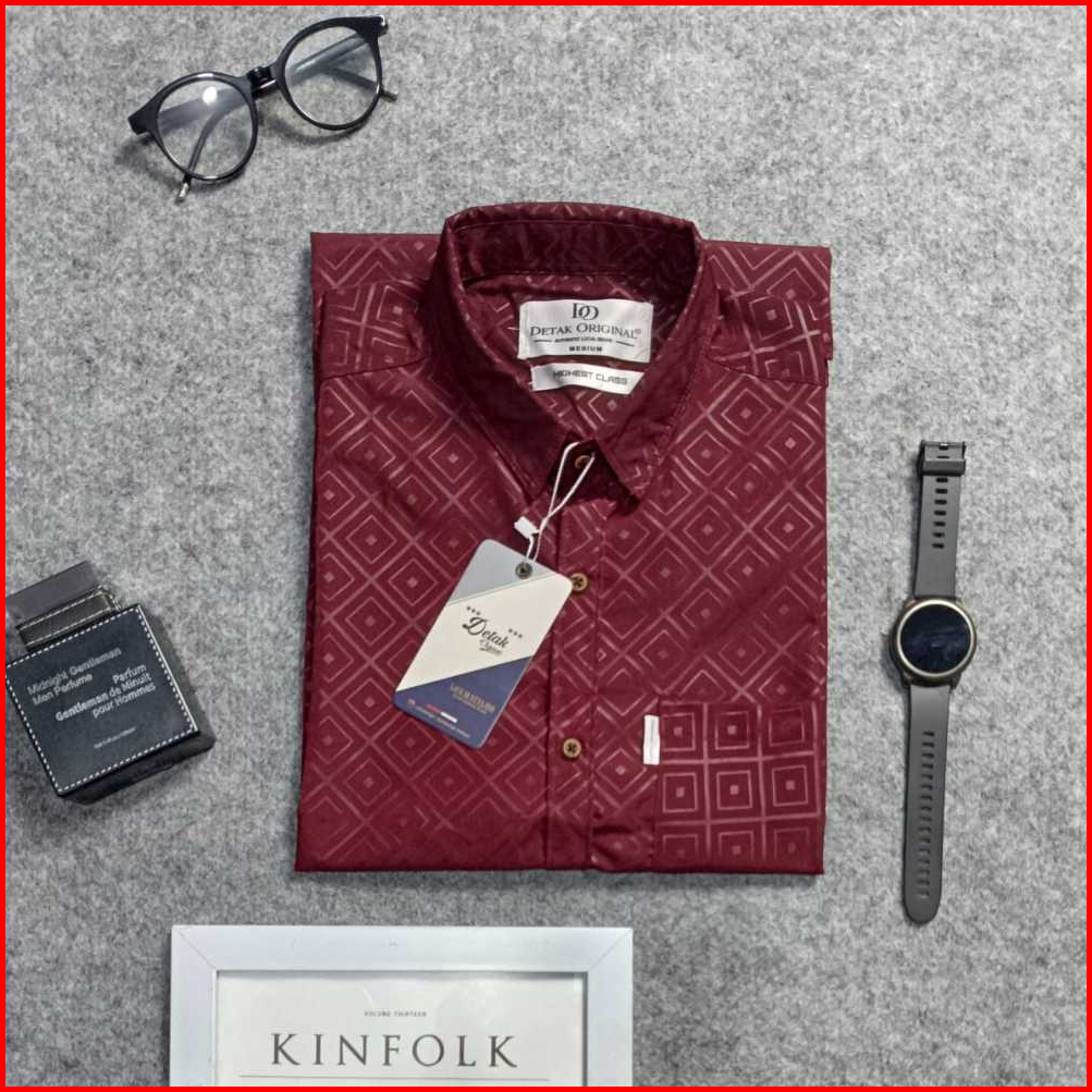 Detak Original - Kemeja Embos Pria Lengan Pendek Motif Diamond Marun