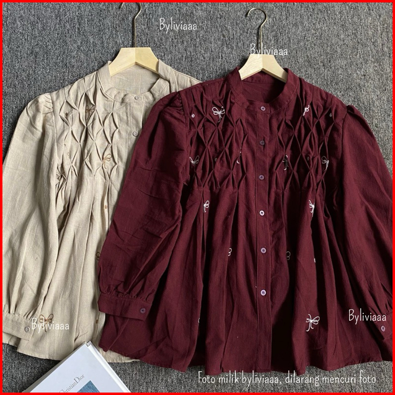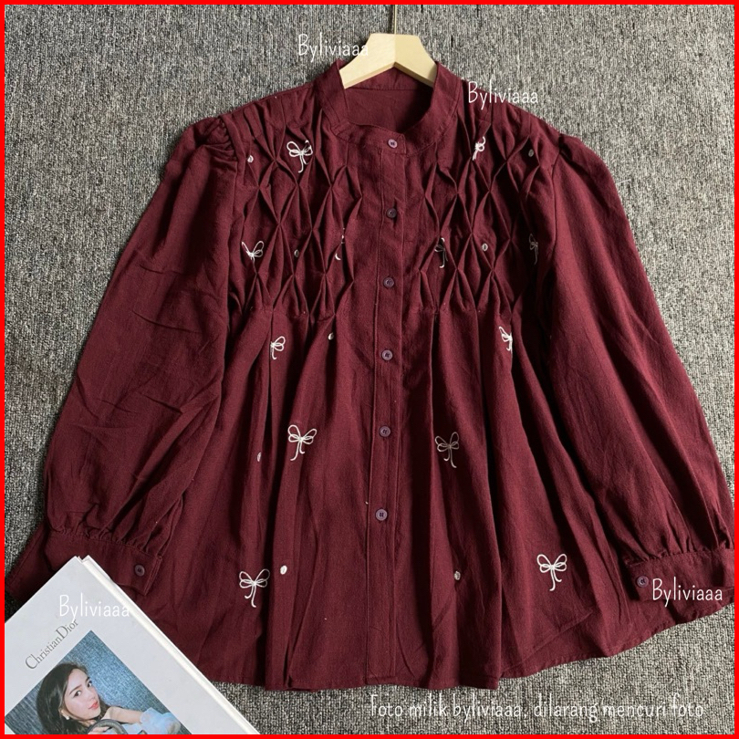 Nadiraa Blouse Embroidery Linen Maroon Terbaru