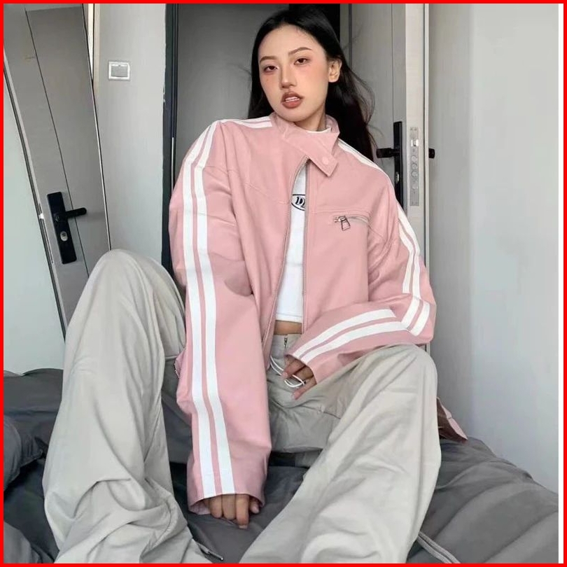 Leather Jaket Strip Oversize By Khalifa Leather Jaket Kulit Wanita Pink Strip Putih Terbaru