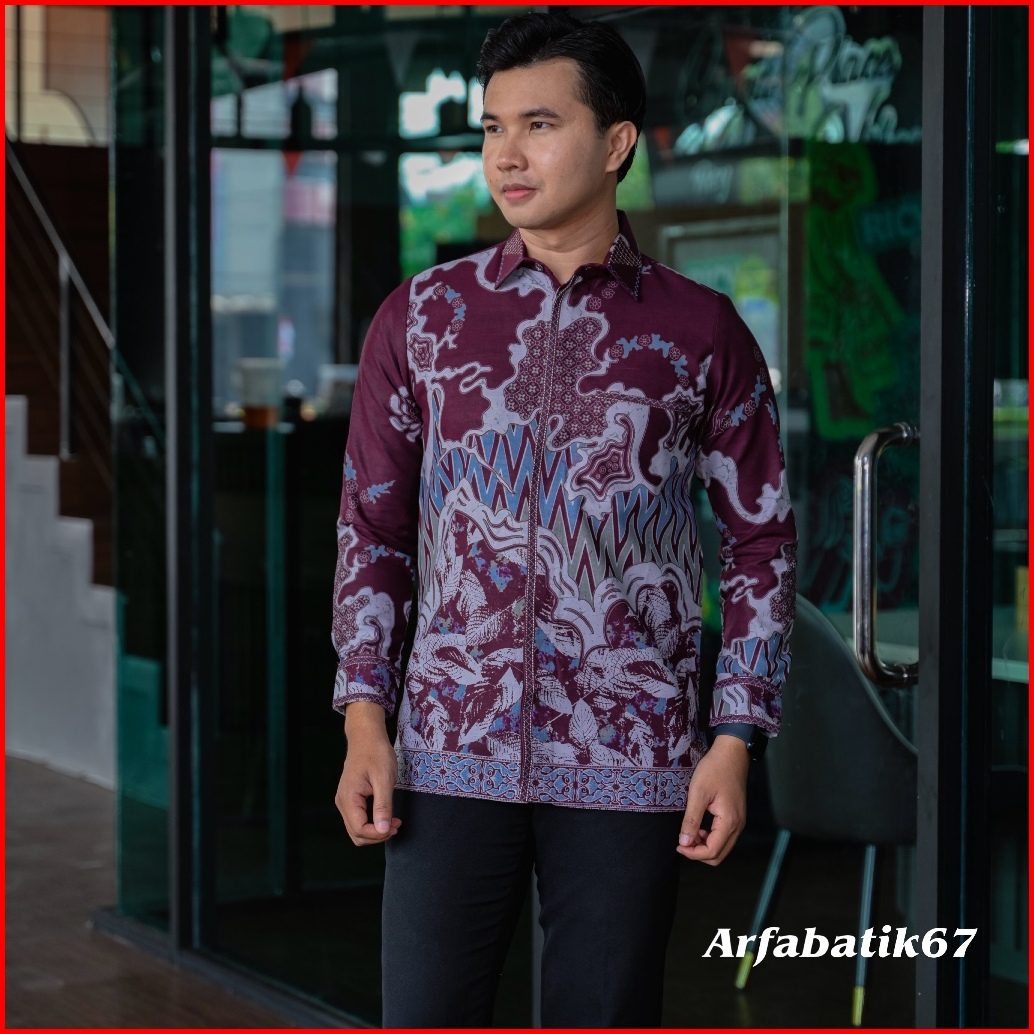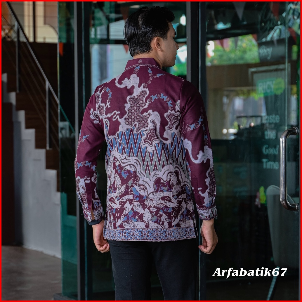 Burgundy Motif Rang Rang Kemeja Batik Smock Bordir Pria Katun Prima Premium Lengan Panjang Lapis Full Furing Trikot Wafl